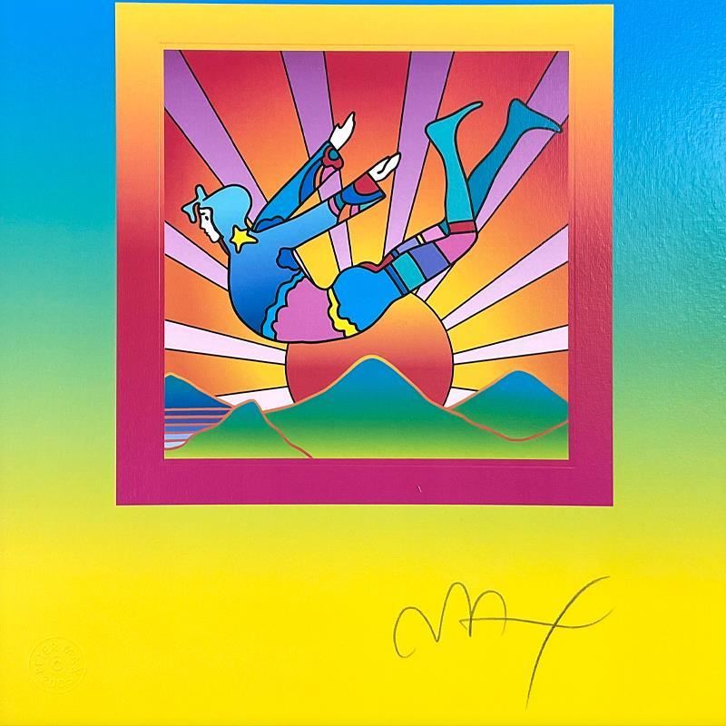 "Cosmic Flyer on Blends" is a limited edition lithograph on paper by Peter Max, numbered and hand signed by the artist. This piece comes framed. Includes Certificate of Authenticity from Peter Max Studios. Measures approx. 23" x 20" (frame), 13" x 10" (image). This item requires special handling and may have a longer than usual turnaround.
