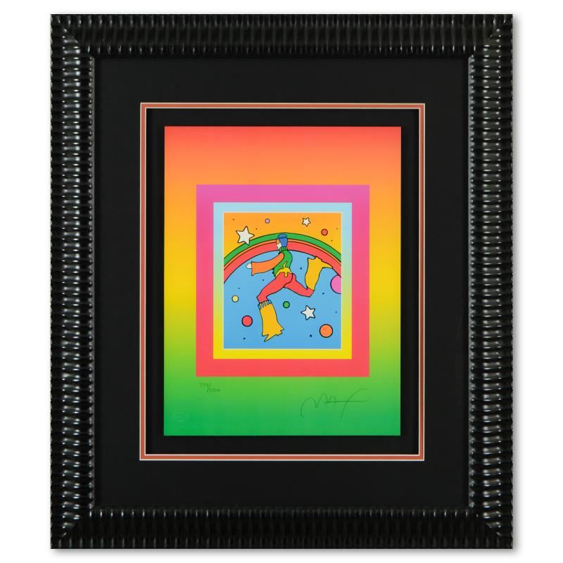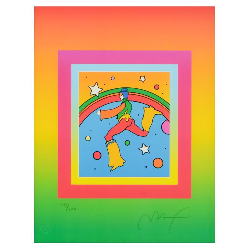 "Cosmic Jumper on Blends" is a limited edition lithograph on paper by Peter Max, numbered 449/500 and hand signed by the artist. This piece comes framed. Includes Certificate of Authenticity from Peter Max Studios. Measures approximately 26" x 30" (frame), 13" x 17" (image).