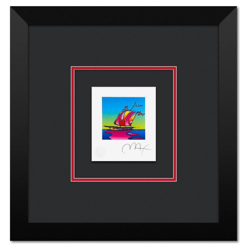 "Cosmic Sailboat" is a limited edition lithograph on paper by Peter Max, numbered and hand signed by the artist. This piece comes framed. Includes Certificate of Authenticity from Peter Max Studios. Measures approx. 13" x 13.5" (frame), 3" x 3.5" (image).