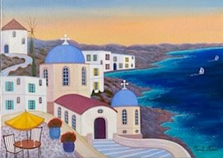A charming 13x18.25" original painting if a Greek village by the sea, on canvas by Fanch Ledan ; with artist's COA,