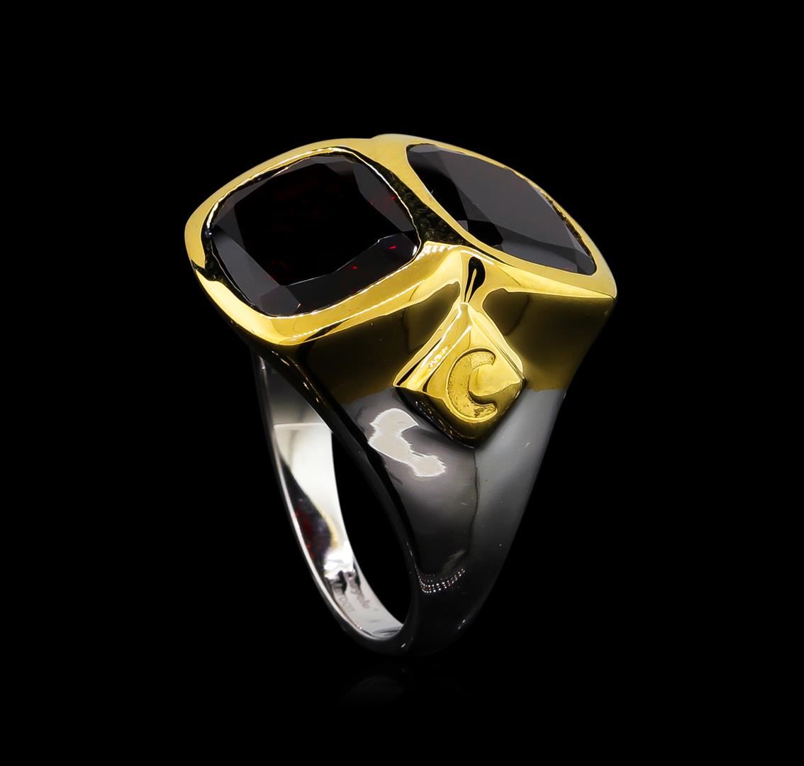 From the brand whose products have inspired creative expression for more than 110 years comes this beautiful ring by Crayola. This stunning piece of jewelry reflects the image and colorful personality of the Crayola brand. The Ring features .925 Silver With Rhodium Two-Tone weighing 6.5oz containing Maroon Garnet (AAA) Cushion 12x10mm (With J BACK & Yellow Pan Rhodium) Laser engraved "C" logo on side. Total Garnet weight is 10.9ct.