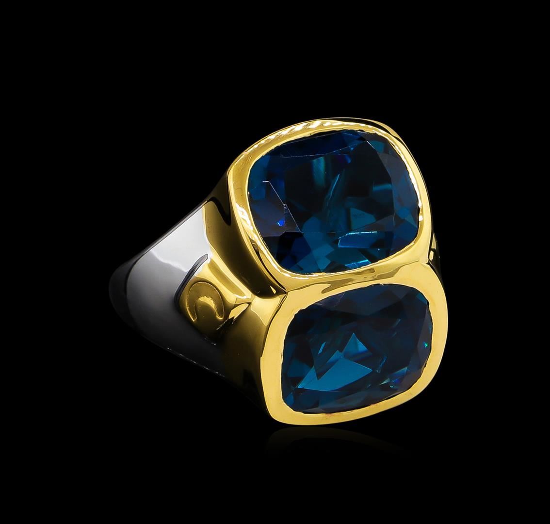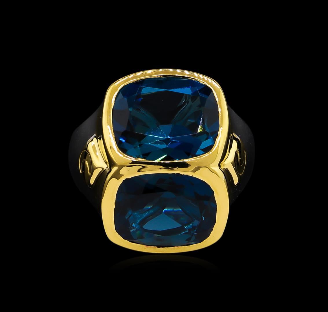 From the brand whose products have inspired creative expression for more than 110 years comes this beautiful ring by Crayola. This stunning piece of jewelry reflects the image and colorful personality of the Crayola brand. The Ring features .925 Silver With Rhodium Two-Tone weighing 6.5oz containing Midnight Blue London Blue Topaz (AAA) Cushion 12x10mm (With J BACK & Yellow Pan Rhodium) Laser engraved "C" logo on side. Total Blue Topaz weight is 10.9ct.