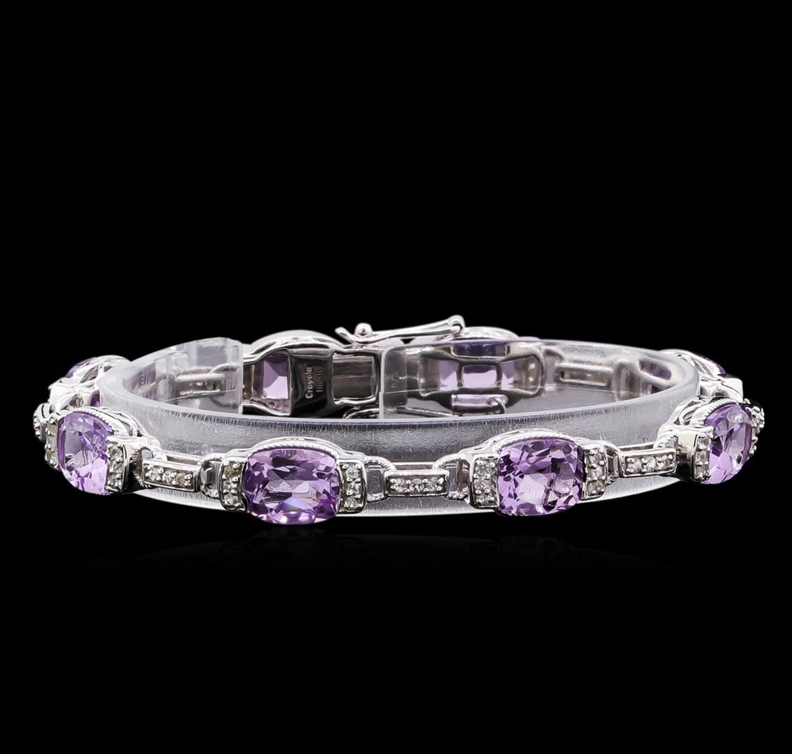 From the brand whose products have inspired creative expression for more than 110 years comes this beautiful bracelet by Crayola. This stunning piece of jewelry reflects the image and colorful personality of the Crayola brand. The Bracelet features .925 Silver With Rhodium weighing 17.73oz containing Blush Dark Pink Amethyst (AAA) Cushion 10x8mm - 8Pcs + Natural White Sapphire Round 1.50mm - 69Pcs (With J BACK). Total Pink Amethyst weight is 17ct. Total White Sapphire weight is 1.17ct. Measures: 7.50".