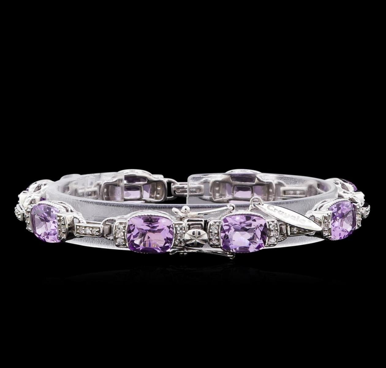 From the brand whose products have inspired creative expression for more than 110 years comes this beautiful bracelet by Crayola. This stunning piece of jewelry reflects the image and colorful personality of the Crayola brand. The Bracelet features .925 Silver With Rhodium weighing 17.73oz containing Blush Dark Pink Amethyst (AAA) Cushion 10x8mm - 8Pcs + Natural White Sapphire Round 1.50mm - 69Pcs (With J BACK). Total Pink Amethyst weight is 17ct. Total White Sapphire weight is 1.17ct. Measures: 7.50".