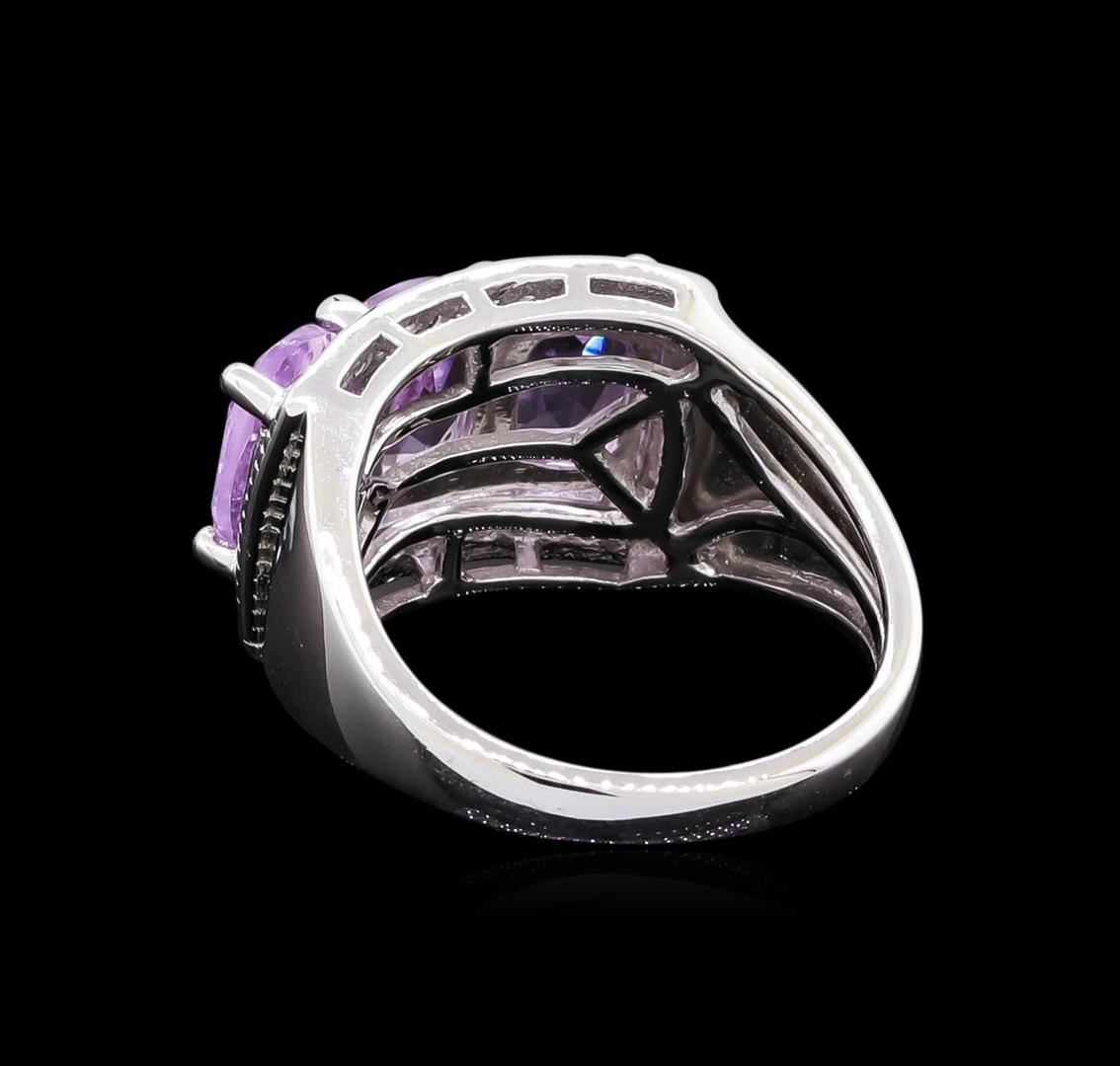 From the brand whose products have inspired creative expression for more than 110 years comes this beautiful ring by Crayola. This stunning piece of jewelry reflects the image and colorful personality of the Crayola brand. The Ring features .925 Silver With Rhodium weighing 4.77oz containing Blush Dark Pink Amethyst (AAA) Cushion 7x5mm - 3Pcs + White Sapphire Dia Cut Round 1.00mm - 22Pcs (With J BACK). Total Pink Amethyst weight is 2.1ct. Total White Sapphire weight is 0.11ct.