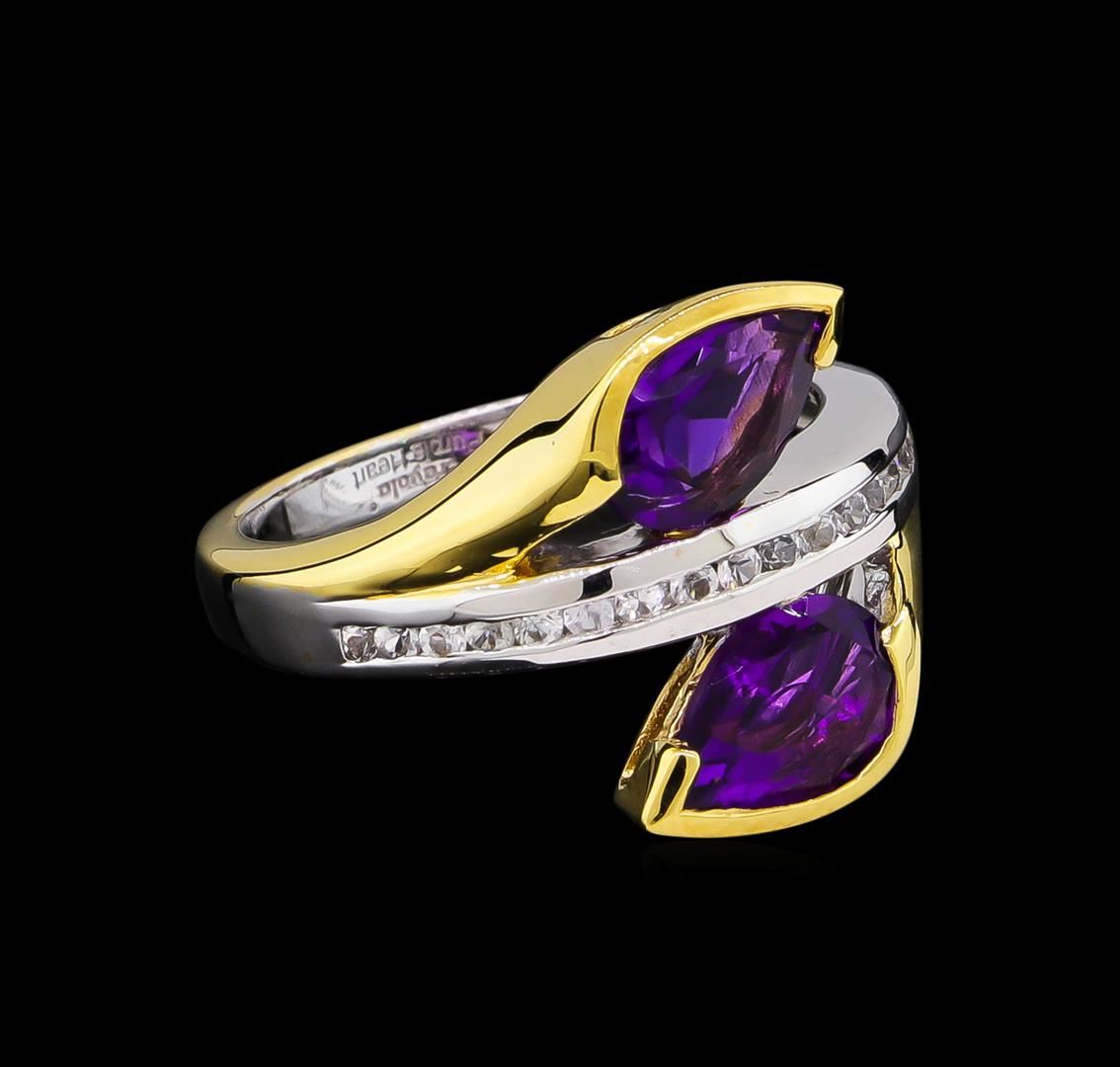 From the brand whose products have inspired creative expression for more than 110 years comes this beautiful ring by Crayola. This stunning piece of jewelry reflects the image and colorful personality of the Crayola brand. The Ring features .925 Silver With Rhodium Two-Tone weighing 4.41oz containing Purple Heart Amethyst (AAA) Pears 9x6mm - 2Pcs + Natural White Sapphire Round 1.50mm - 18Pcs (With J BACK & Yellow Pan Rhodium). Total Amethyst weight is 2.2ct. Total White Sapphire weight is 0.31ct.