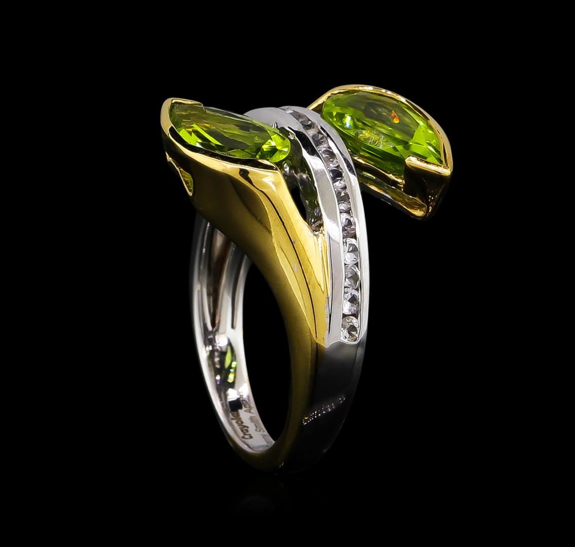 From the brand whose products have inspired creative expression for more than 110 years comes this beautiful ring by Crayola. This stunning piece of jewelry reflects the image and colorful personality of the Crayola brand. The Ring features .925 Silver With Rhodium Two-Tone weighing 4.41oz containing Granny Smith Apple Peridot (AAA) Pears 9x6mm - 2Pcs + Natural White Sapphire Round 1.50mm - 18Pcs (With J BACK & Yellow Pan Rhodium). Total Peridot weight is 2.2ct. Total White Sapphire weight is 0.31ct.