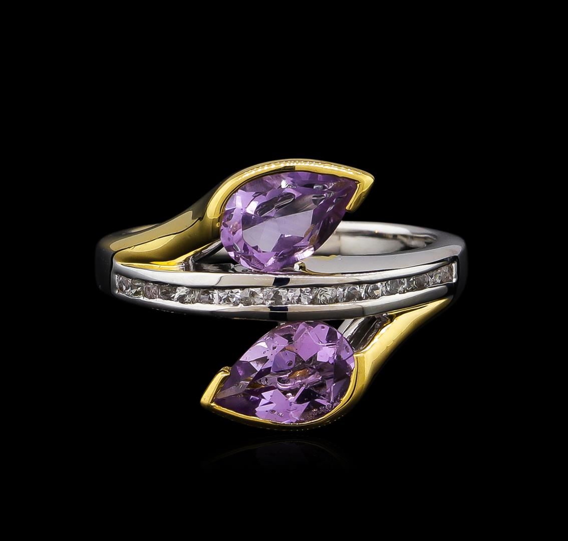 From the brand whose products have inspired creative expression for more than 110 years comes this beautiful ring by Crayola. This stunning piece of jewelry reflects the image and colorful personality of the Crayola brand. The Ring features .925 Silver With Rhodium Two-Tone weighing 4.41oz containing Blush Dark Pink Amethyst (AAA) Pears 9x6mm - 2Pcs + Natural White Sapphire Round 1.50mm - 18Pcs (With J BACK & Yellow Pan Rhodium). Total Pink Amethyst weight is 2.2ct. Total White Sapphire weight is 0.31ct.