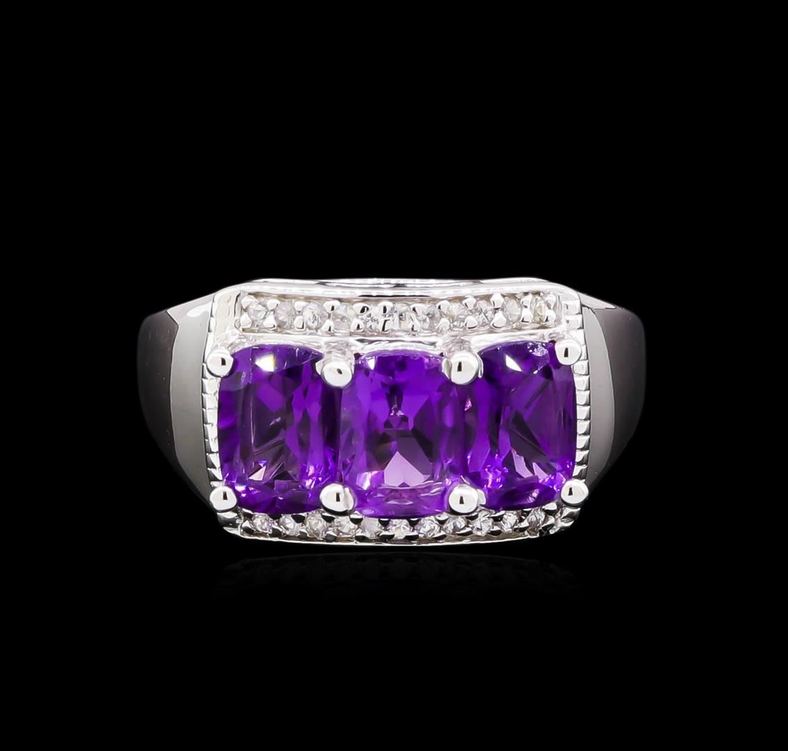 From the brand whose products have inspired creative expression for more than 110 years comes this beautiful ring by Crayola. This stunning piece of jewelry reflects the image and colorful personality of the Crayola brand. The Ring features .925 Silver With Rhodium weighing 4.77oz containing Purple Heart Amethyst (AAA) Cushion 7x5mm - 3Pcs + White Sapphire Dia Cut Round 1.00mm - 22Pcs (With J BACK). Total Amethyst weight is 2.4ct. Total White Sapphire weight is 0.11ct.
