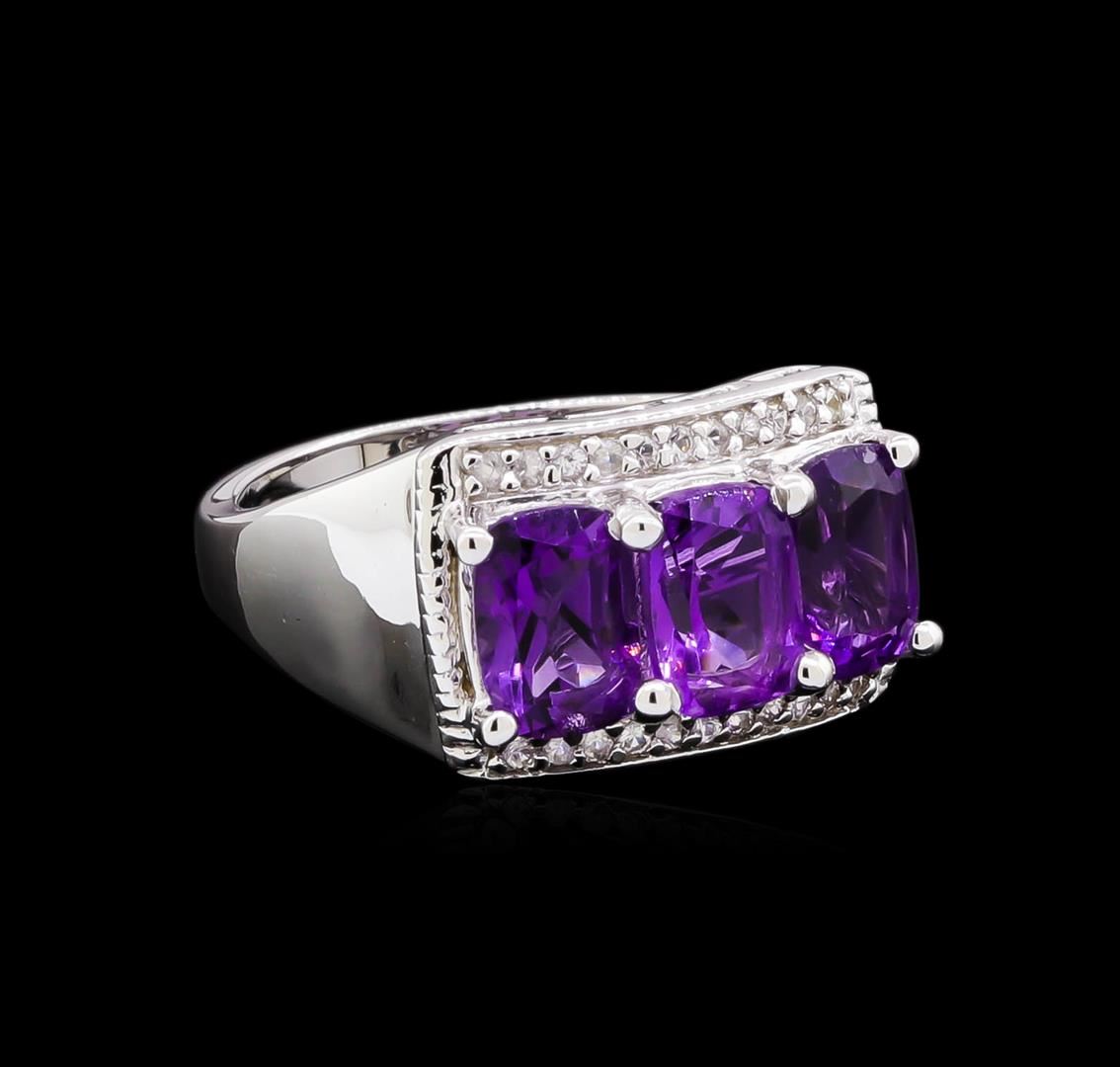 From the brand whose products have inspired creative expression for more than 110 years comes this beautiful ring by Crayola. This stunning piece of jewelry reflects the image and colorful personality of the Crayola brand. The Ring features .925 Silver With Rhodium weighing 4.77oz containing Purple Heart Amethyst (AAA) Cushion 7x5mm - 3Pcs + White Sapphire Dia Cut Round 1.00mm - 22Pcs (With J BACK). Total Amethyst weight is 2.4ct. Total White Sapphire weight is 0.11ct.