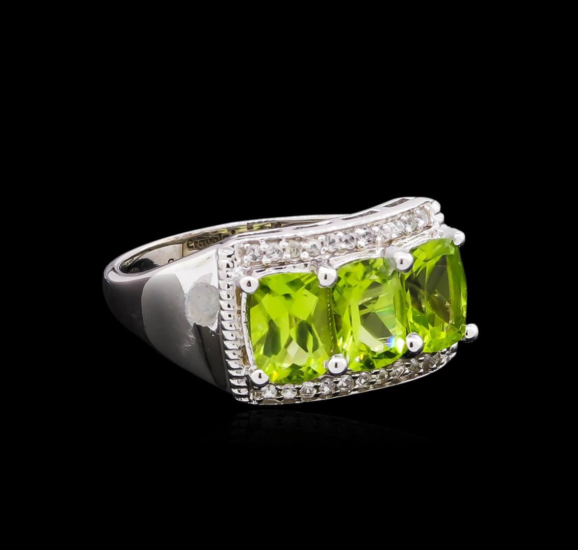 From the brand whose products have inspired creative expression for more than 110 years comes this beautiful ring by Crayola. This stunning piece of jewelry reflects the image and colorful personality of the Crayola brand. The Ring features .925 Silver With Rhodium weighing 4.77oz containing Granny Smith Apple Peridot (AAA) Cushion 7x5mm - 3Pcs + White Sapphire Dia Cut Round 1.00mm - 22Pcs (With J BACK). Total Peridot weight is 2.4ct. Total White Sapphire weight is 0.11ct.