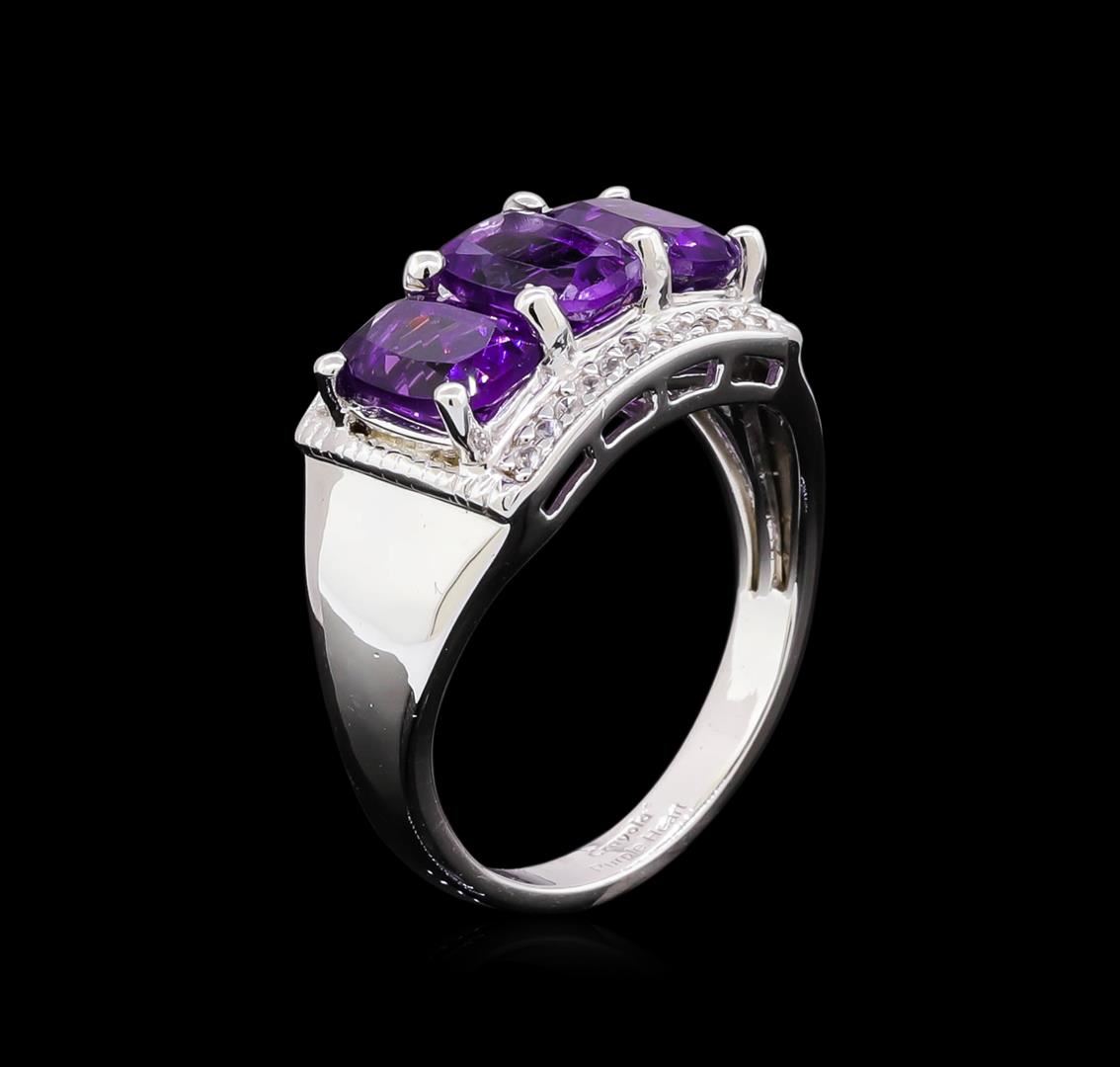 From the brand whose products have inspired creative expression for more than 110 years comes this beautiful ring by Crayola. This stunning piece of jewelry reflects the image and colorful personality of the Crayola brand. The Ring features .925 Silver With Rhodium weighing 4.77oz containing Purple Heart Amethyst (AAA) Cushion 7x5mm - 3Pcs + White Sapphire Dia Cut Round 1.00mm - 22Pcs (With J BACK). Total Amethyst weight is 2.4ct. Total White Sapphire weight is 0.11ct.