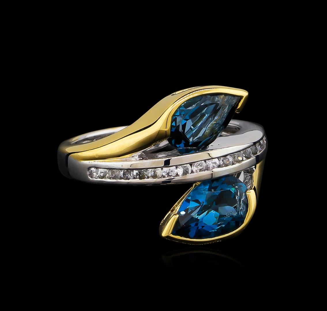 From the brand whose products have inspired creative expression for more than 110 years comes this beautiful ring by Crayola. This stunning piece of jewelry reflects the image and colorful personality of the Crayola brand. The Ring features .925 Silver With Rhodium Two-Tone weighing 4.41oz containing Midnight Blue London Blue Topaz (AAA) Pears 9x6mm - 2Pcs + Natural White Sapphire Round 1.50mm - 18Pcs (With J BACK & Yellow Pan Rhodium). Total Blue Topaz weight is 2.6ct. Total White Sapphire weight is 0.31ct.
