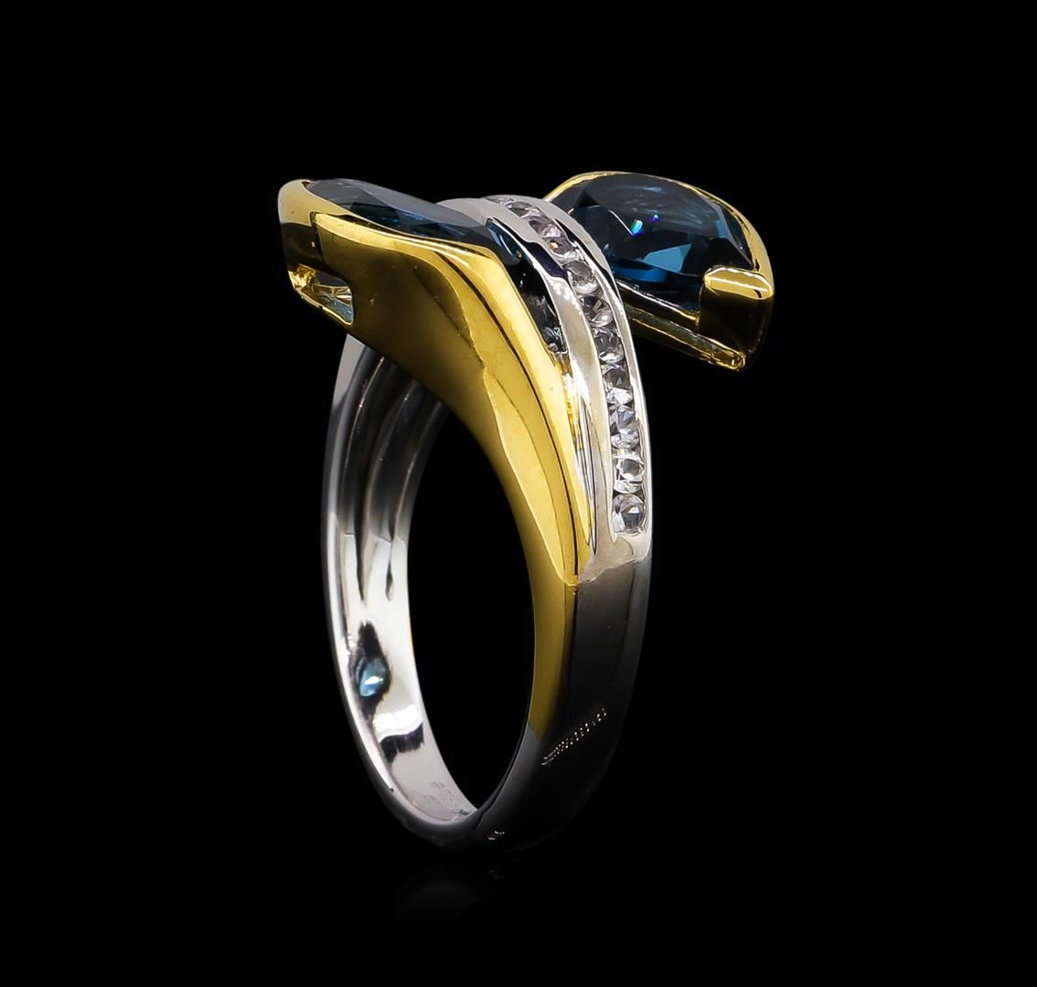 From the brand whose products have inspired creative expression for more than 110 years comes this beautiful ring by Crayola. This stunning piece of jewelry reflects the image and colorful personality of the Crayola brand. The Ring features .925 Silver With Rhodium Two-Tone weighing 4.41oz containing Midnight Blue London Blue Topaz (AAA) Pears 9x6mm - 2Pcs + Natural White Sapphire Round 1.50mm - 18Pcs (With J BACK & Yellow Pan Rhodium). Total Blue Topaz weight is 2.6ct. Total White Sapphire weight is 0.31ct.