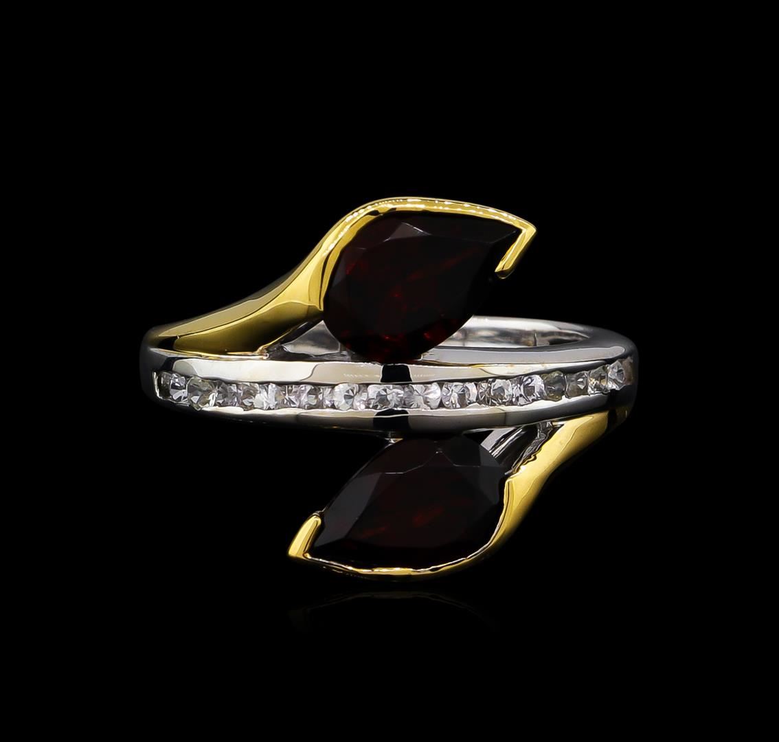 From the brand whose products have inspired creative expression for more than 110 years comes this beautiful ring by Crayola. This stunning piece of jewelry reflects the image and colorful personality of the Crayola brand. The Ring features .925 Silver With Rhodium Two-Tone weighing 4.41oz containing Maroon Garnet (AAA) Pears 9x6mm - 2Pcs + Natural White Sapphire Round 1.50mm - 18Pcs (With J BACK & Yellow Pan Rhodium). Total Garnet weight is 2.6ct. Total White Sapphire weight is 0.31ct.