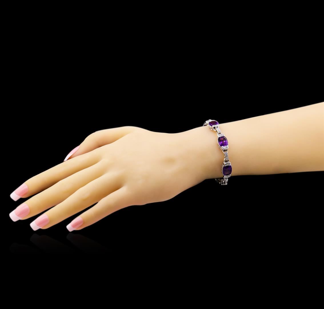 From the brand whose products have inspired creative expression for more than 110 years comes this beautiful bracelet by Crayola. This stunning piece of jewelry reflects the image and colorful personality of the Crayola brand. The Bracelet features.925 Silver With Rhodium weighing 17.73oz containing Purple Heart Amethyst (AAA) Cushion 10x8mm - 8Pcs + Natural White Sapphire Round 1.50mm - 69Pcs (With J BACK). Total Amethyst weight is 20ct. Total White Sapphire weight is 1.17ct. Measures: 7.50".