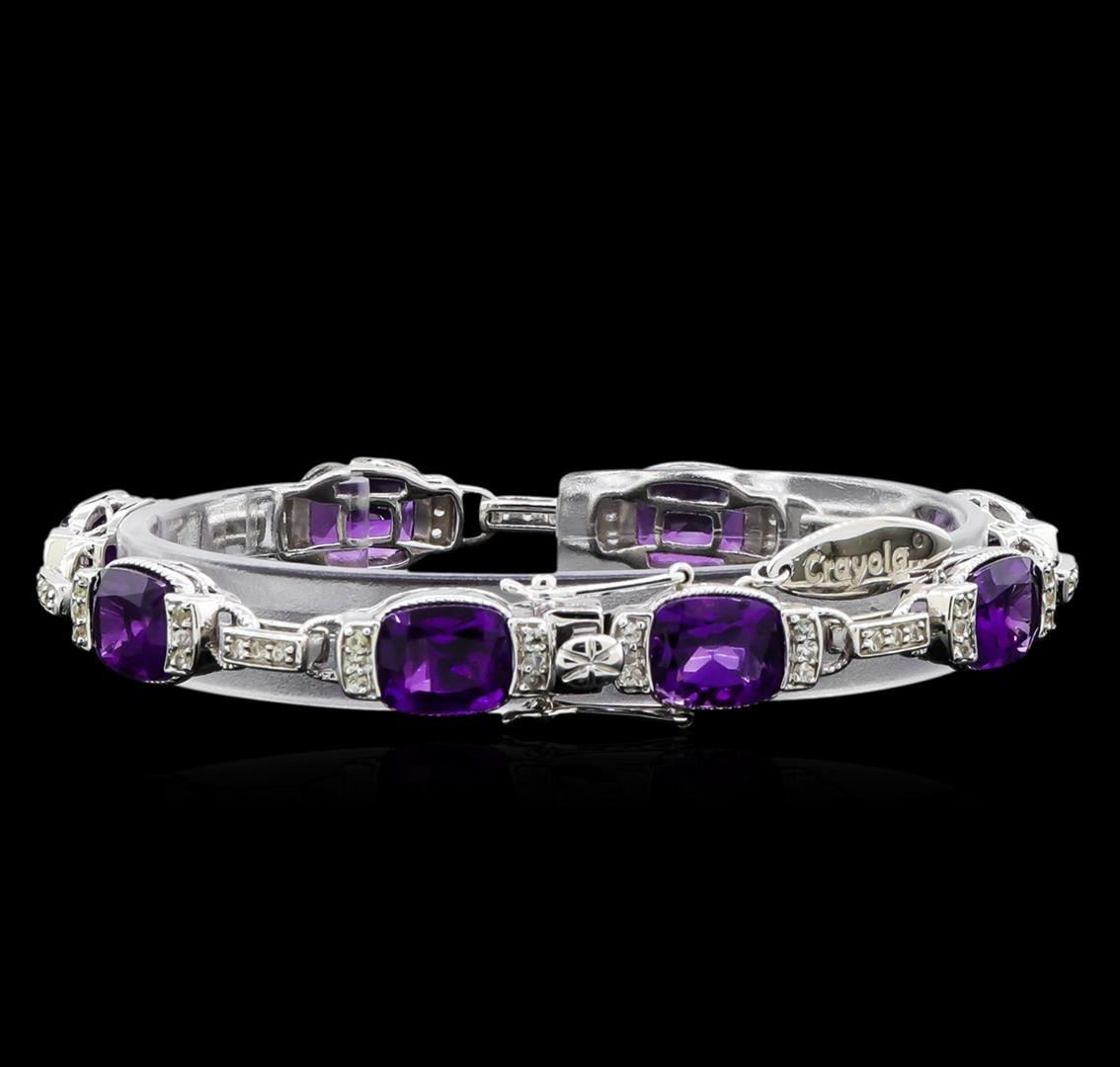 From the brand whose products have inspired creative expression for more than 110 years comes this beautiful bracelet by Crayola. This stunning piece of jewelry reflects the image and colorful personality of the Crayola brand. The Bracelet features.925 Silver With Rhodium weighing 17.73oz containing Purple Heart Amethyst (AAA) Cushion 10x8mm - 8Pcs + Natural White Sapphire Round 1.50mm - 69Pcs (With J BACK). Total Amethyst weight is 20ct. Total White Sapphire weight is 1.17ct. Measures: 7.50".