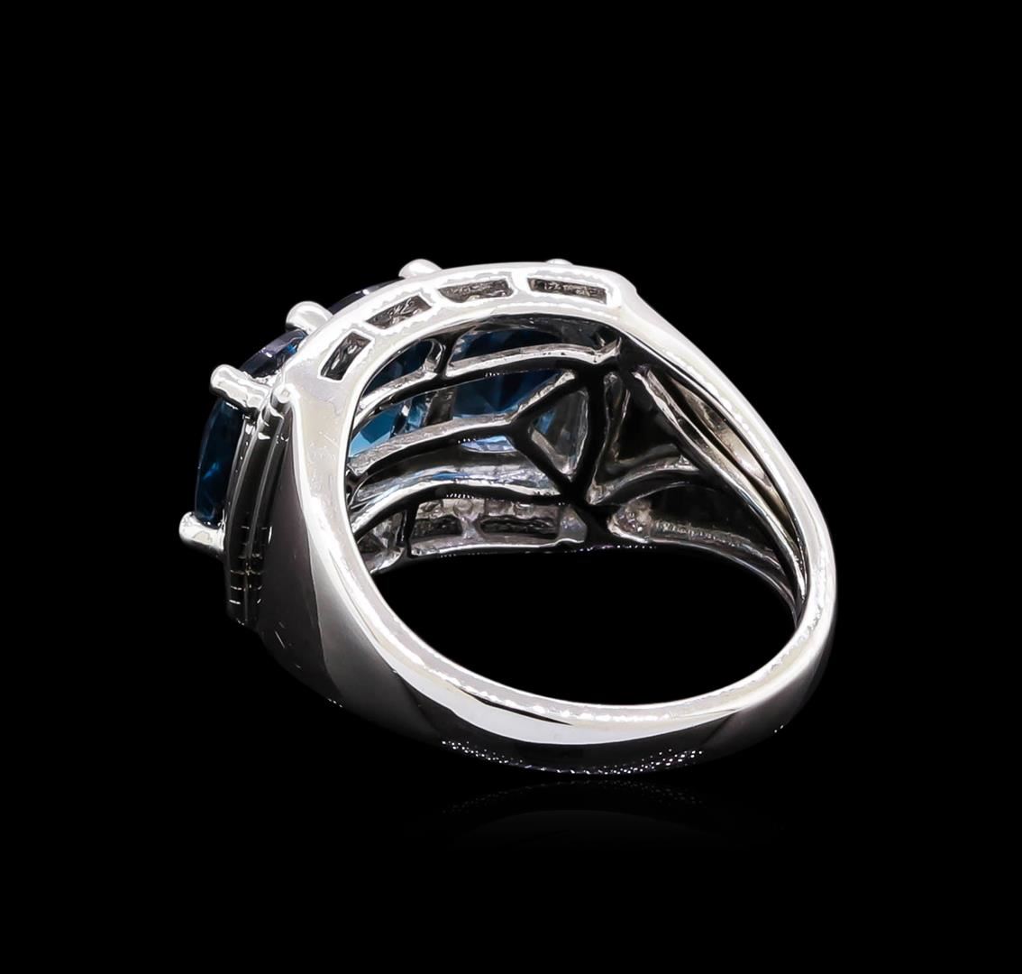 From the brand whose products have inspired creative expression for more than 110 years comes this beautiful ring by Crayola. This stunning piece of jewelry reflects the image and colorful personality of the Crayola brand. The Ring features .925 Silver With Rhodium weighing 4.77oz containing Midnight Blue London Blue Topaz (AAA) Cushion 7x5mm - 3Pcs + White Sapphire Dia Cut Round 1.00mm - 22Pcs (With J BACK). Total Blue Topaz weight is 3ct. Total White Sapphire weight is 0.11ct.