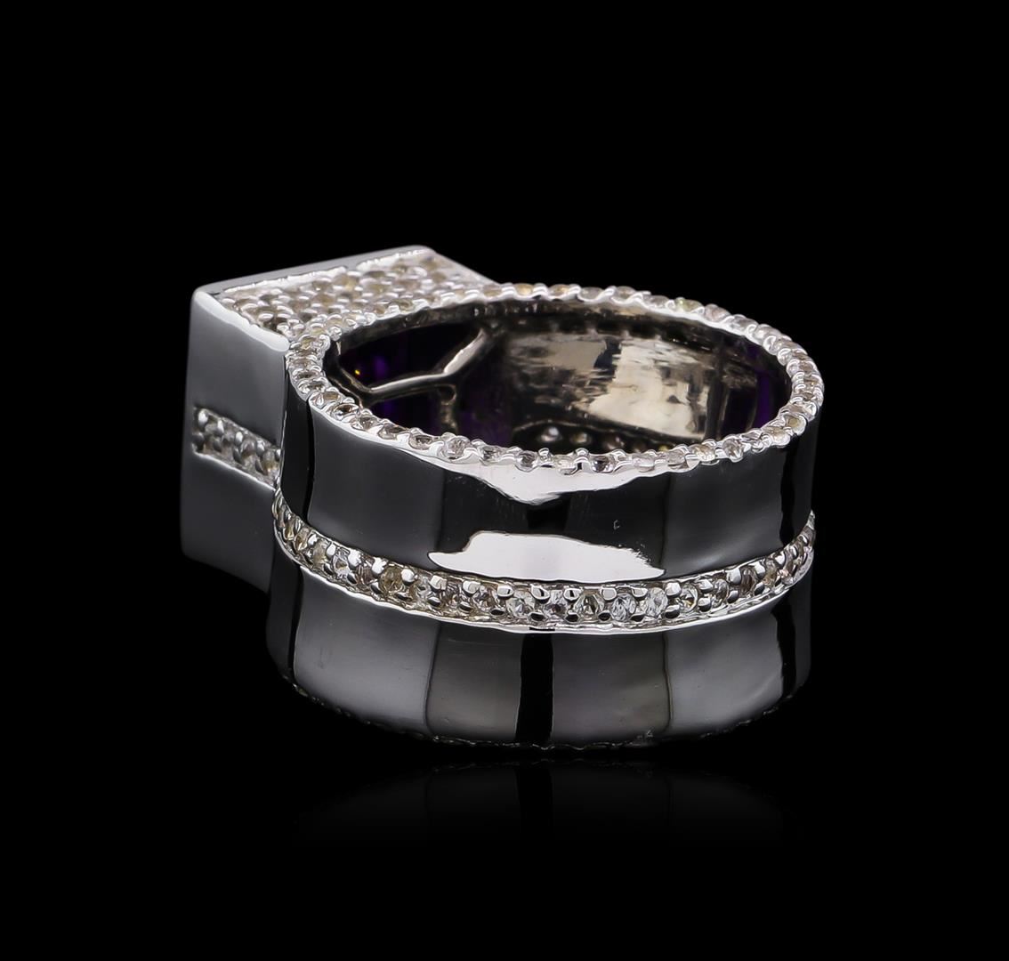 From the brand whose products have inspired creative expression for more than 110 years comes this beautiful ring by Crayola. This stunning piece of jewelry reflects the image and colorful personality of the Crayola brand. The Ring features .925 Silver With Rhodium weighing 8.2oz containing Purple Heart Amethyst (AAA) Square 9.00mm - 1Pc + Natural White Sapphire Round 1.10mm - 195Pcs (With J BACK). Total Amethyst weight is 3.5ct. Total White Sapphire weight is 1.76ct.