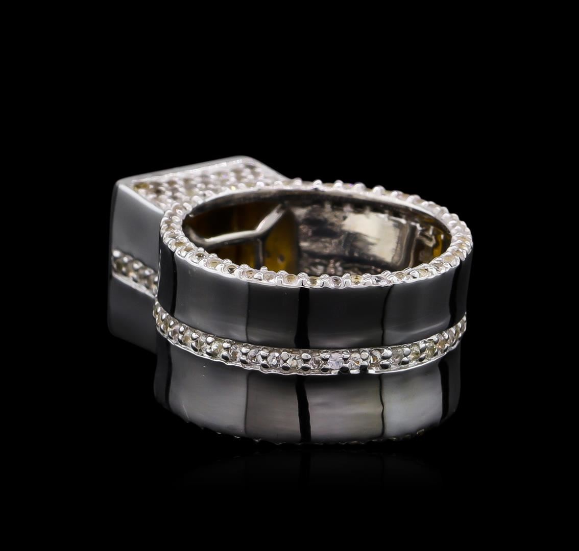 From the brand whose products have inspired creative expression for more than 110 years comes this beautiful ring by Crayola. This stunning piece of jewelry reflects the image and colorful personality of the Crayola brand. The Ring features .925 Silver With Rhodium weighing 8.2oz containing Neon Carrot Citrine (AAA) Square 9.00mm - 1Pc + Natural White Sapphire Round 1.10mm - 195Pcs (With J BACK). Total Citrine weight is 3.5ct. Total White Sapphire weight is 1.76ct.