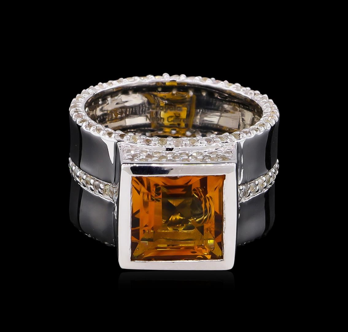 From the brand whose products have inspired creative expression for more than 110 years comes this beautiful ring by Crayola. This stunning piece of jewelry reflects the image and colorful personality of the Crayola brand. The Ring features .925 Silver With Rhodium weighing 8.2oz containing Neon Carrot Citrine (AAA) Square 9.00mm - 1Pc + Natural White Sapphire Round 1.10mm - 195Pcs (With J BACK). Total Citrine weight is 3.5ct. Total White Sapphire weight is 1.76ct.
