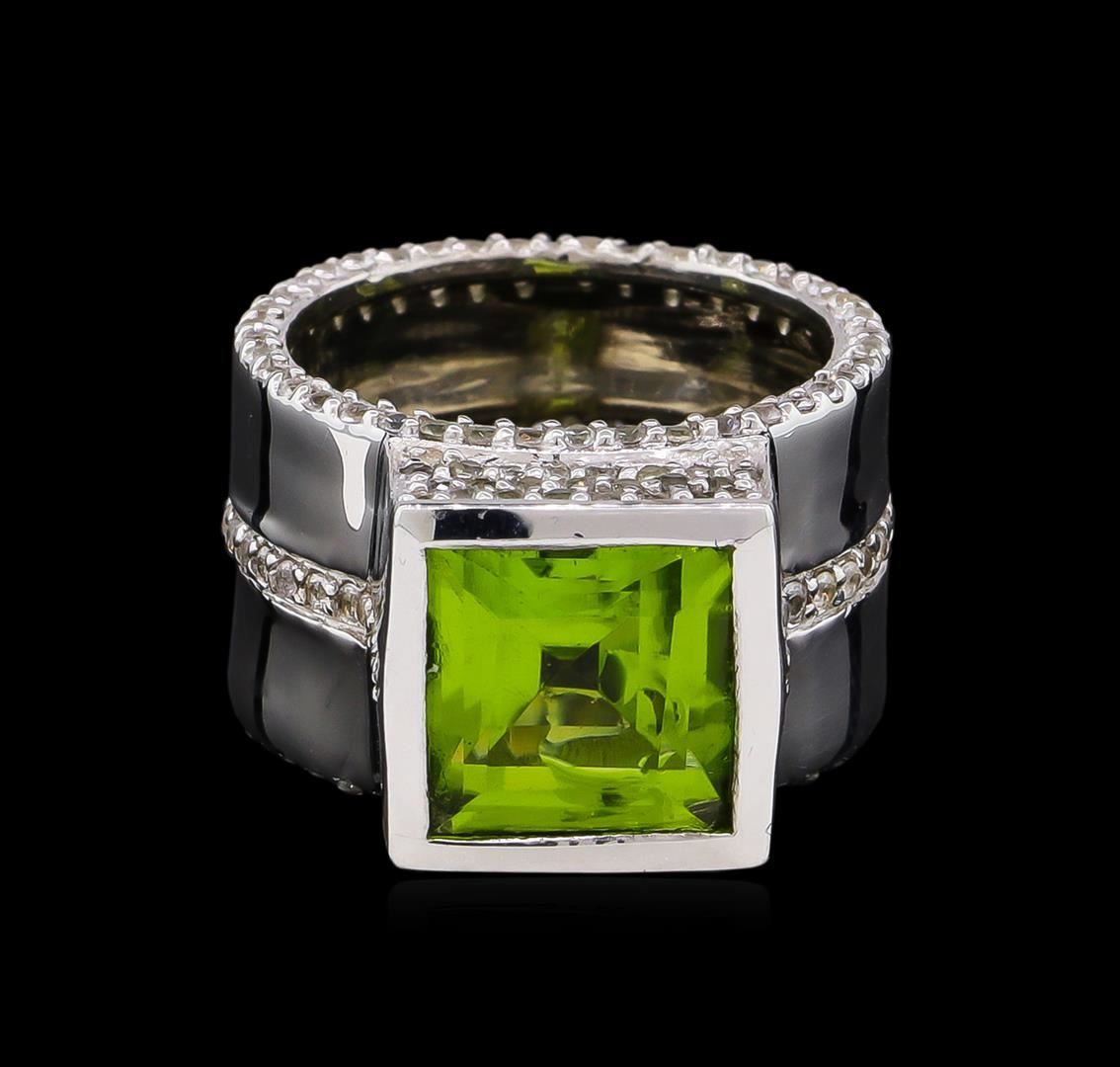 From the brand whose products have inspired creative expression for more than 110 years comes this beautiful ring by Crayola. This stunning piece of jewelry reflects the image and colorful personality of the Crayola brand. The Ring features .925 Silver With Rhodium weighing 8.2oz containing Granny Smith Apple Peridot (AAA) Square 9.00mm - 1Pc + Natural White Sapphire Round 1.10mm - 195Pcs (With J BACK). Total Peridot weight is 3.5ct. Total White Sapphire weight is 1.76ct.