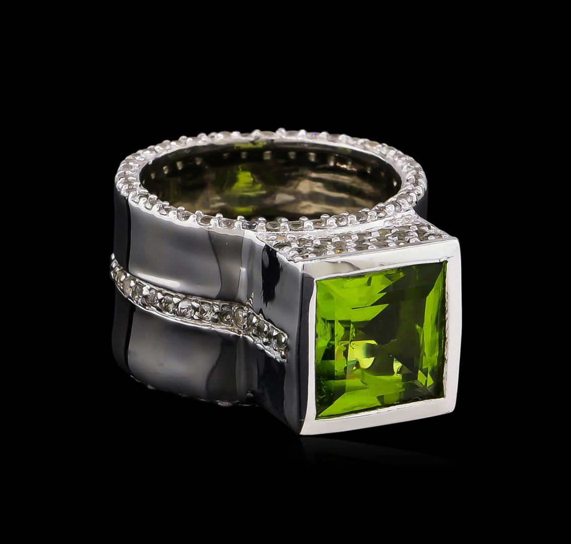 From the brand whose products have inspired creative expression for more than 110 years comes this beautiful ring by Crayola. This stunning piece of jewelry reflects the image and colorful personality of the Crayola brand. The Ring features .925 Silver With Rhodium weighing 8.2oz containing Granny Smith Apple Peridot (AAA) Square 9.00mm - 1Pc + Natural White Sapphire Round 1.10mm - 195Pcs (With J BACK). Total Peridot weight is 3.5ct. Total White Sapphire weight is 1.76ct.