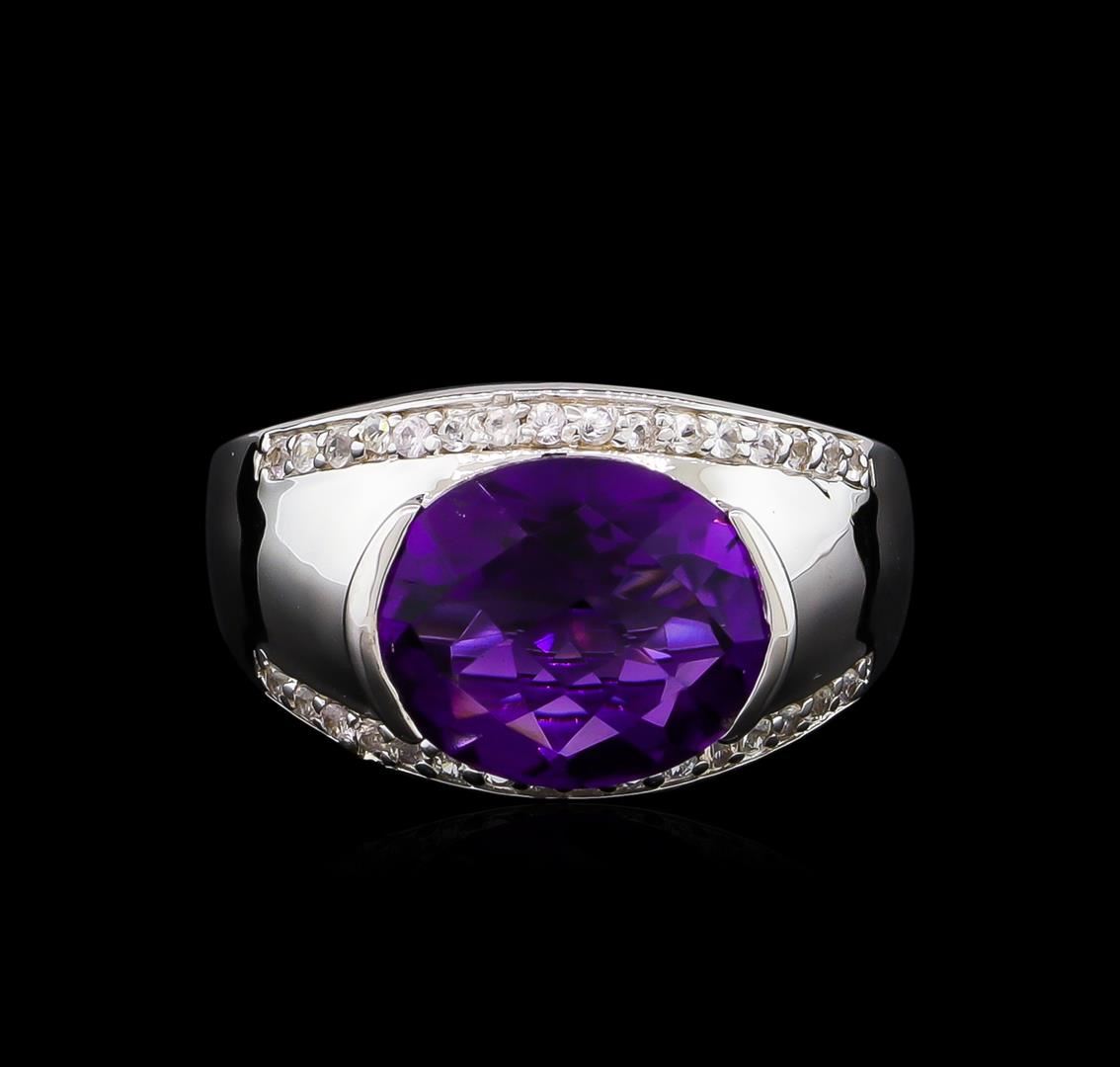 From the brand whose products have inspired creative expression for more than 110 years comes this beautiful ring by Crayola. This stunning piece of jewelry reflects the image and colorful personality of the Crayola brand. The Ring features .925 Silver With Rhodium weighing 5.58oz containing Purple Heart Amethyst (AAA) CB Oval 12x10mm - 1Pc + Natural White Sapphire Round 1.20mm - 32Pcs (With J BACK). Total Amethyst weight is 3.95ct. Total White Sapphire weight is 0.38ct.