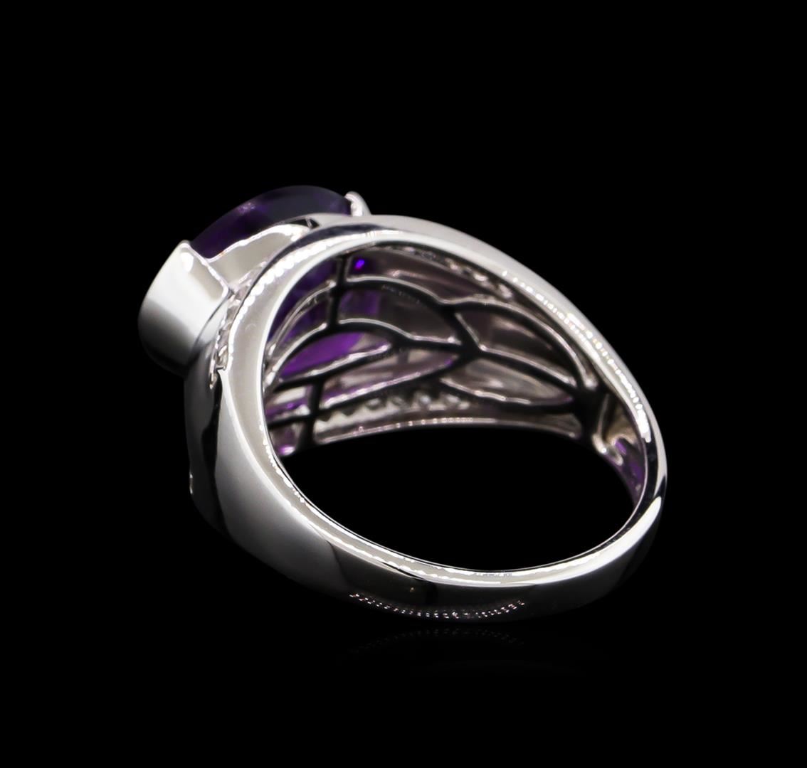 From the brand whose products have inspired creative expression for more than 110 years comes this beautiful ring by Crayola. This stunning piece of jewelry reflects the image and colorful personality of the Crayola brand. The Ring features .925 Silver With Rhodium weighing 5.58oz containing Purple Heart Amethyst (AAA) CB Oval 12x10mm - 1Pc + Natural White Sapphire Round 1.20mm - 32Pcs (With J BACK). Total Amethyst weight is 3.95ct. Total White Sapphire weight is 0.38ct.