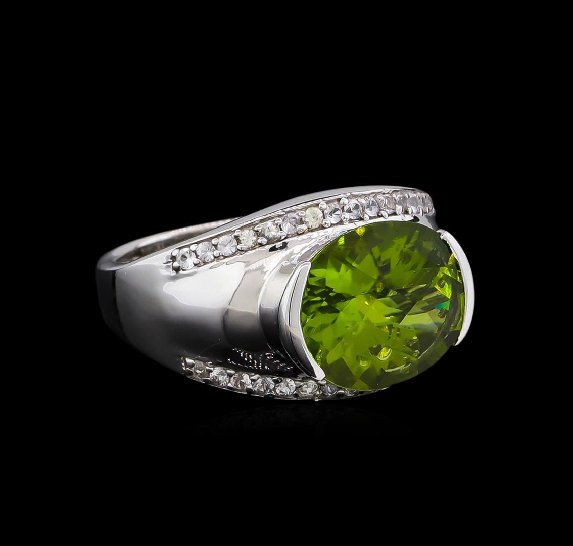 From the brand whose products have inspired creative expression for more than 110 years comes this beautiful ring by Crayola. This stunning piece of jewelry reflects the image and colorful personality of the Crayola brand. The Ring features .925 Silver With Rhodium weighing 5.58oz containing Granny Smith Apple Peridot (AAA) CB Oval 12x10mm - 1Pc + Natural White Sapphire Round 1.20mm - 32Pcs (With J BACK). Total Peridot weight is 3.95ct. Total White Sapphire weight is 0.38ct.