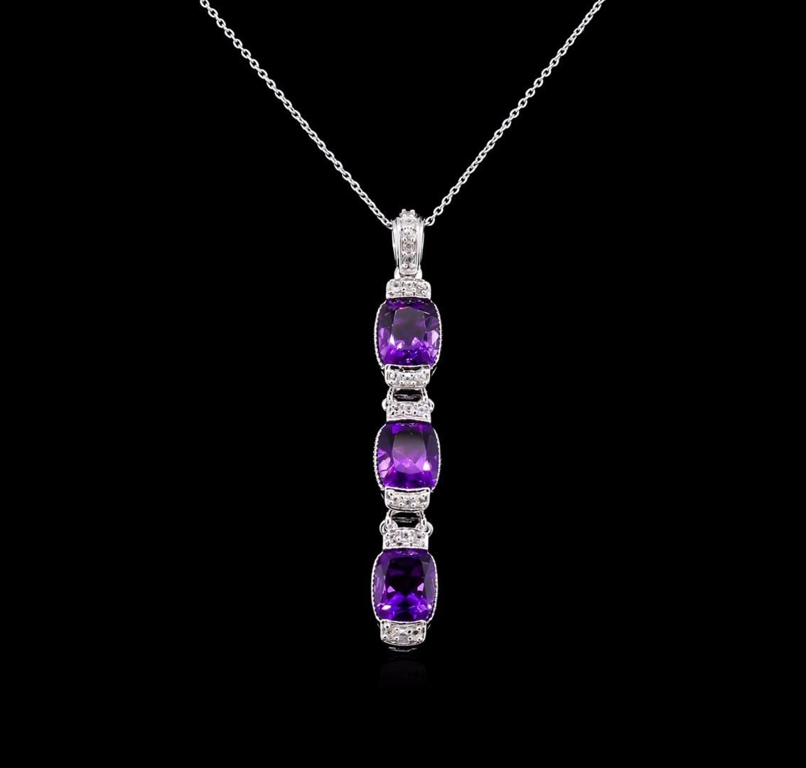 From the brand whose products have inspired creative expression for more than 110 years comes this beautiful pendant with chain by Crayola. This stunning piece of jewelry reflects the image and colorful personality of the Crayola brand. The Pendant With Chain features .925 Silver With Rhodium weighing 6.28oz containing Purple Heart Amethyst (AAA) Cushion 10x8mm - 3Pcs + Natural White Sapphire Round 1.50mm - 23Pcs (With J BACK). Total Amethyst weight is 7.8ct. Total White Sapphire weight is 0.39ct. Measures: 18".