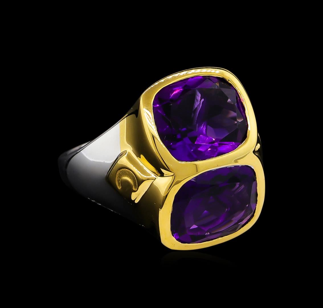 From the brand whose products have inspired creative expression for more than 110 years comes this beautiful ring by Crayola. This stunning piece of jewelry reflects the image and colorful personality of the Crayola brand. The Ring features .925 Silver With Rhodium Two-Tone weighing 6.5oz containing Purple Heart Amethyst (AAA) Cushion 12x10mm (With J BACK & Yellow Pan Rhodium) Laser engraved "C" logo on side. Total Amethyst weight is 8.9ct.