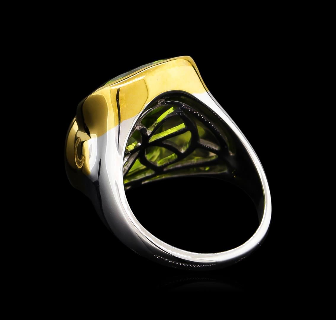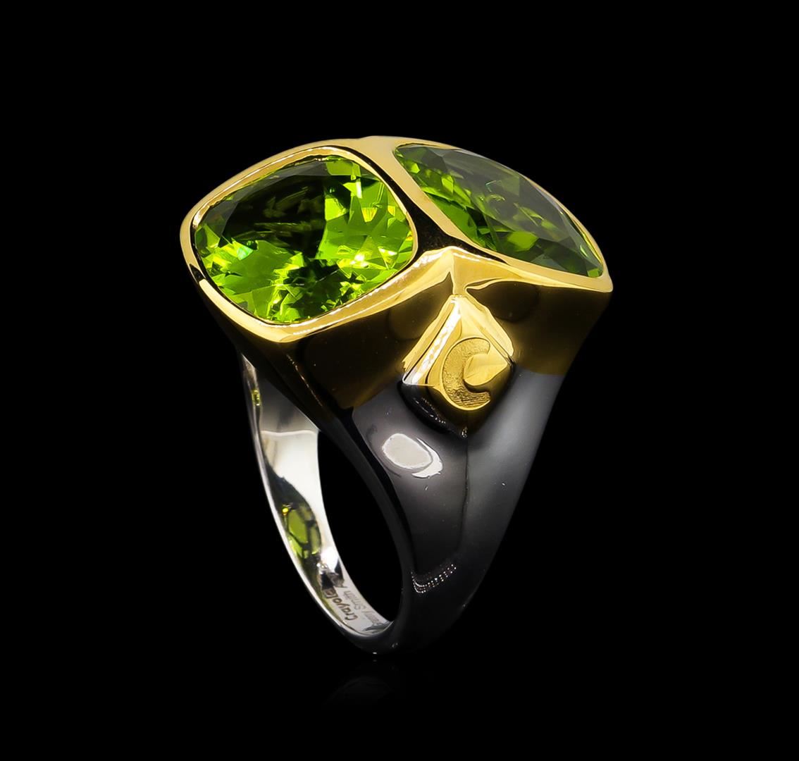 From the brand whose products have inspired creative expression for more than 110 years comes this beautiful ring by Crayola. This stunning piece of jewelry reflects the image and colorful personality of the Crayola brand. The Ring features .925 Silver With Rhodium Two-Tone weighing 6.5oz containing Granny Smith Apple Peridot (AAA) Cushion 12x10mm (With J BACK & Yellow Pan Rhodium) Laser engraved "C" logo on side. Total Peridot weight is 8.9ct.