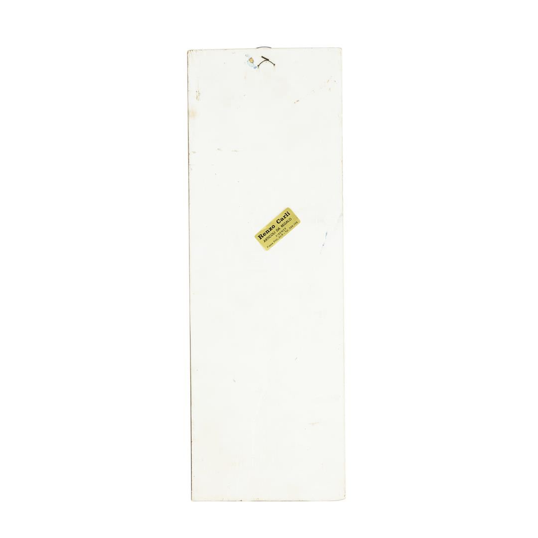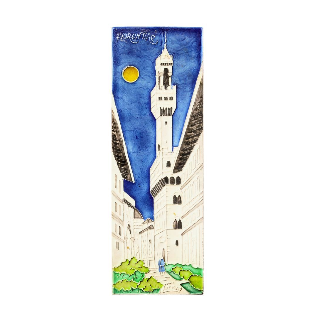 This hand painted Creazioni Luciano tile features a European walkway through a tower lined town. Beautiful colors of blue, green, and cream. Two figures shown. This art tile measures 5 1/4 inches by 15 1/4 inches. The title is in excellent condition with no chips, cracks, or repairs.