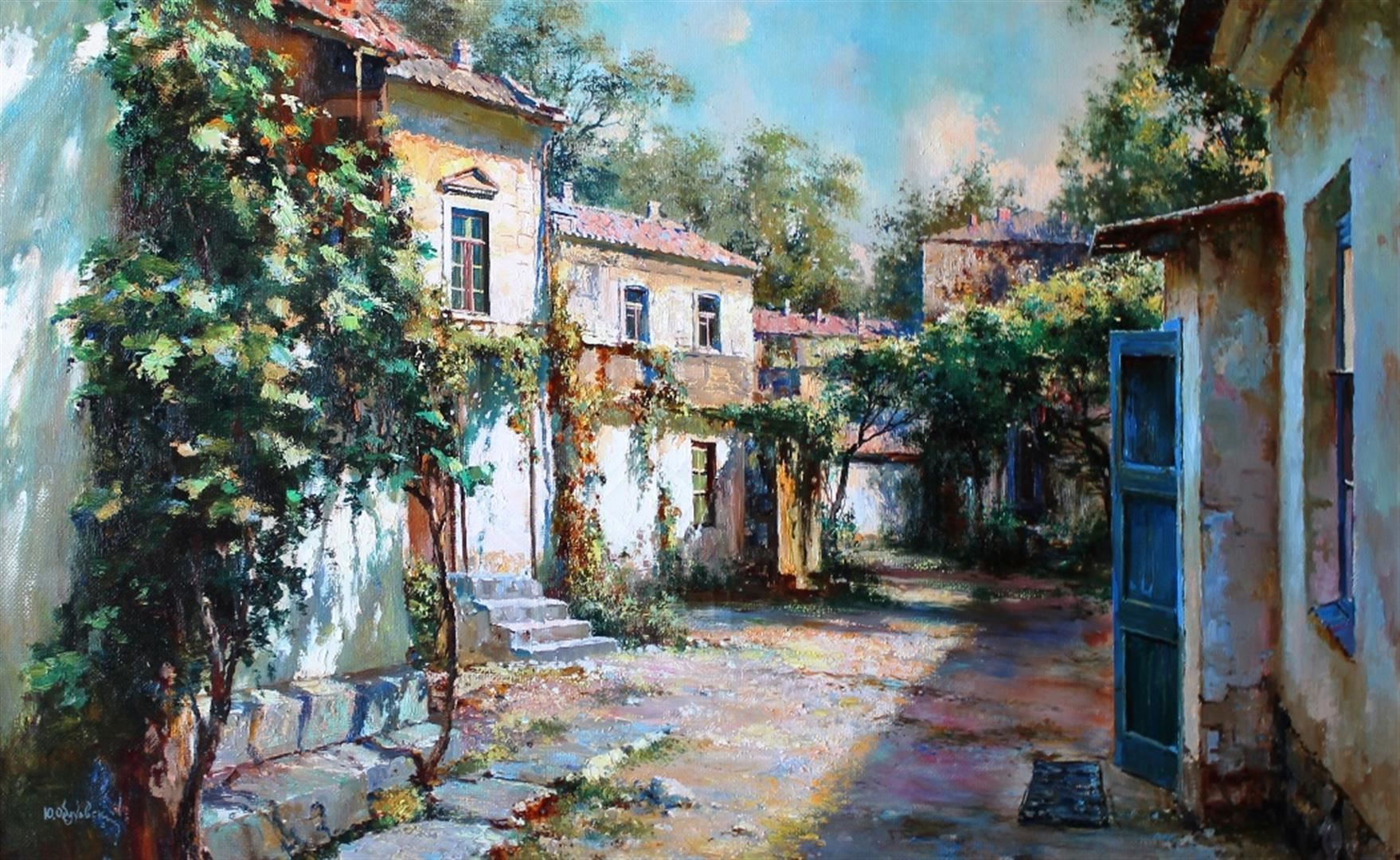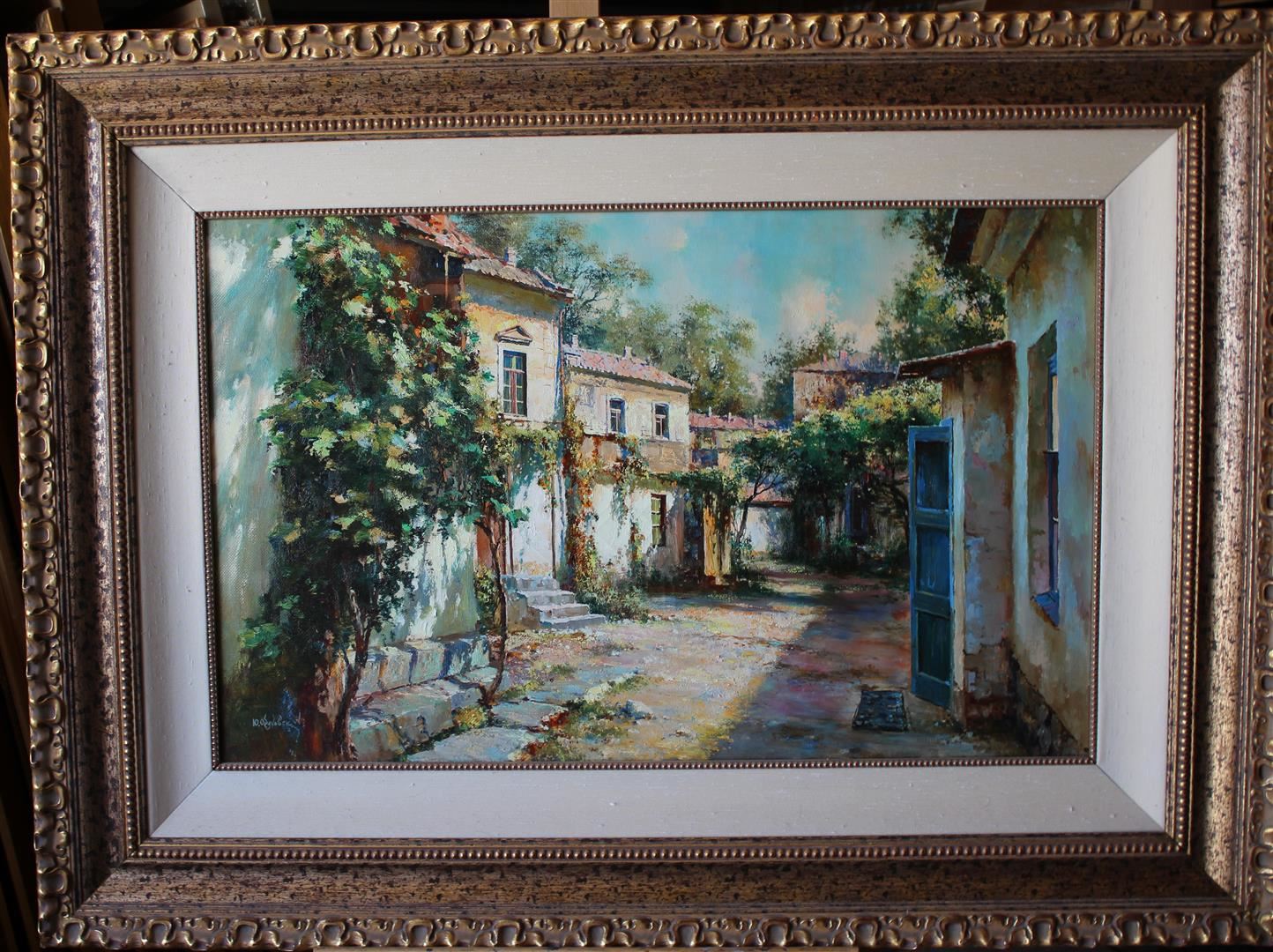 The rich pastels of an old-world Crimean residence are beautifully displayed in artist Yuri Obuhovskiy's oil on linen. The painting measures 19.5 x 30.5; framed image measures approx. 31.5 x 42.5.