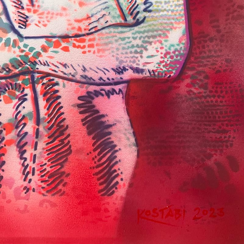 "Crimson Bond" is an original mixed media painting on paper by Mark Kostabi, hand signed by the artist. The piece comes framed. Includes Certificate of Authenticity. Measures approx. 35.5" x 48" (frame), 29.5" x 42" (image). This item requires special handling and may have a longer than usual turnaround.