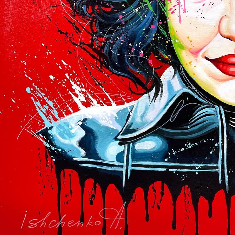 "Cruella de Vil" is an original acrylic painting on canvas by Alexander Ishchenko, hand signed by the artist. Includes Letter of Authenticity. Measures approx. 36" x 36" (image).
