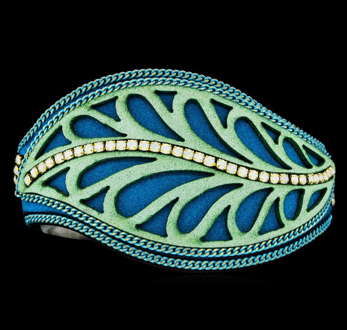 High end designer jewelry. Crystal Leaf Bracelet - Gold Plated. Gold Plated Mag Clasp. Blue/ Gold. 7.5inches. Total Weight: 25.2 grams.