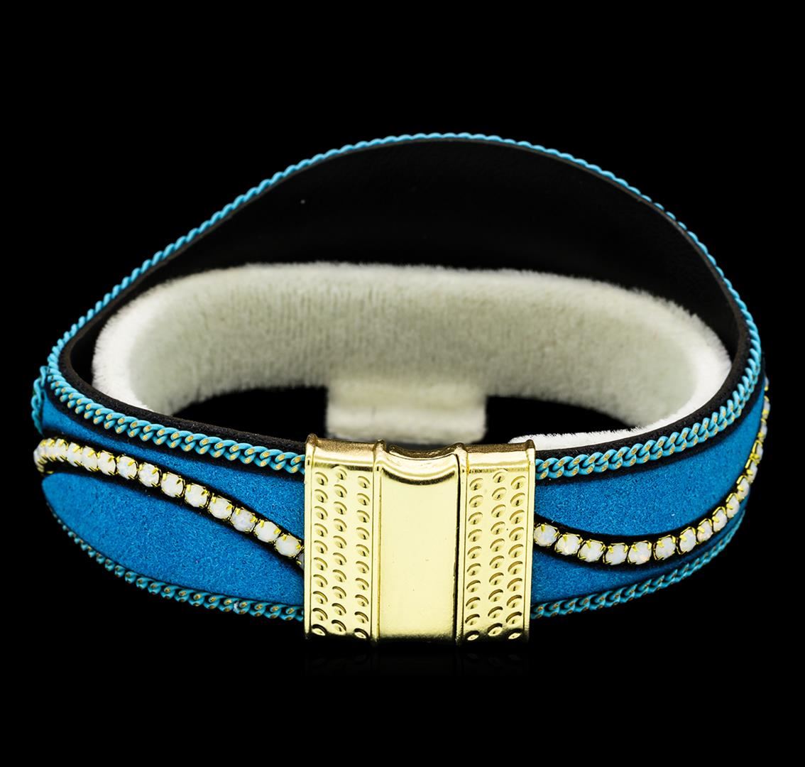 High end designer jewelry. Crystal Leaf Bracelet - Gold Plated. Gold Plated Mag Clasp. Blue/ Gold. 7.5inches. Total Weight: 25.2 grams.