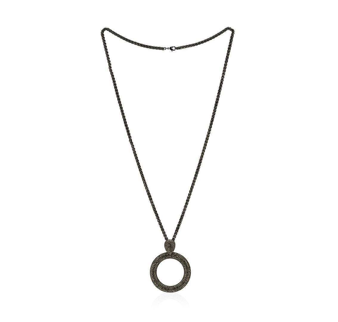 High end designer jewelry. Crystal Pave Circle Pendant Necklace - Rhodium Plated. Rhodium Plated Chain L. Necklace. Black/ Smoky. 32/2.5inches. Total Weight: 61.9 grams.