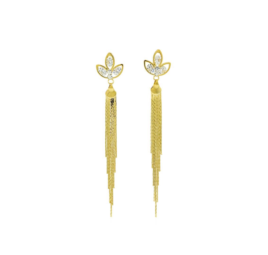 High end designer jewelry. Crystal Petal Post Tassel Earrings - Gold Plated. Gold Plated Post Set. Clear/ Gold. 3"Dangle.