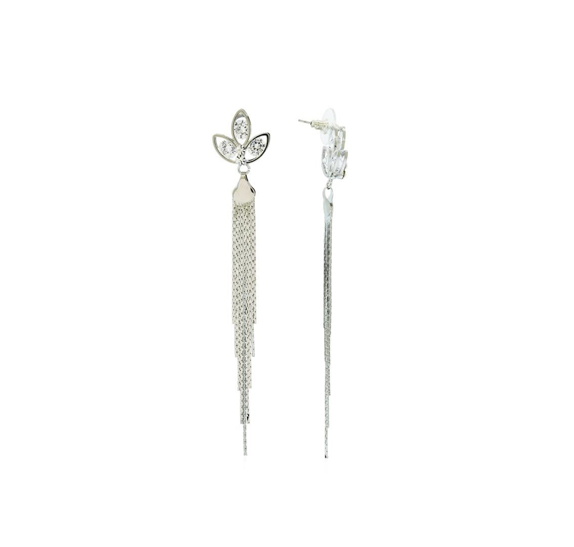 High end designer jewelry. Crystal Petal Post Tassel Earrings - Silver Plated. Silver Plated Post Set. Clear/ Silver. 3"Dangle.