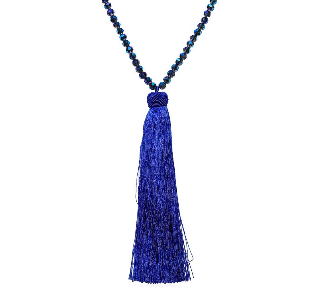 High end designer jewelry. Crystal Tassel Necklace. Czech Crystal. Blue. 30/6inches.