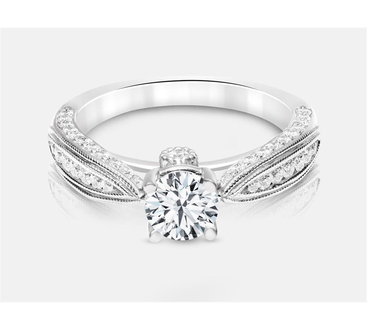 18K WG diamond in shank engagement setting set w/ 60-0.59 Cts G-H SI2 side stones w/ a 5.8 mm CZ Center.