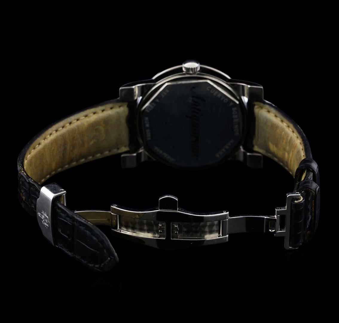 One, Cuervo y Sobrinos Habana Torpedo wristwatch electronically tested Stainless Steel, Case: 40mm diameter, Case Back: engraved with manufacturers name, logo, and ID numbers, Crown: scalloped, Bezel: diamond set, Crystal: synthetic sapphire lens, Movement: automatic. Cuervo y Sobrinos Habana signed Dial: Silver color; with pointed hands, Bracelet: saddle stitched leather strap, Condition: G-5 Fine. Eight and one quarter inch length, adjustable. Concealed buckle clasp. Containing: One Hundred Twenty Eight round brilliant cut diamonds approximate total weight of stones equals 1.04ct. Set & graded in the bezel. Clarity: VVS-2. Color: G - H. Total Weight of Diamonds 1.04ct. Total Weight of Watch 85.38gm. AIG Appraised at $4,050.00.