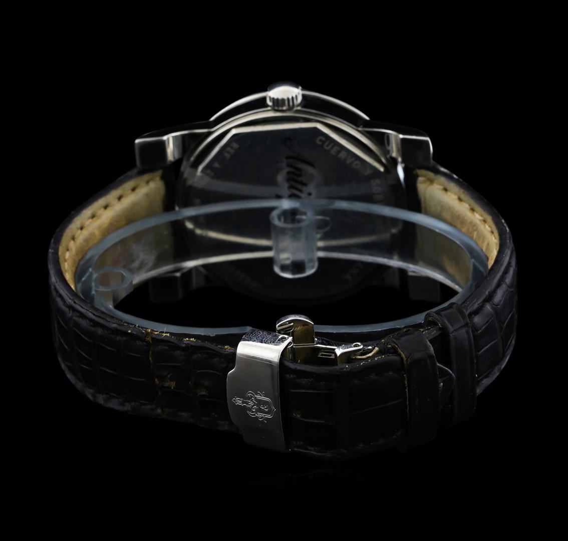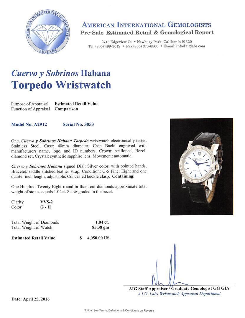 One, Cuervo y Sobrinos Habana Torpedo wristwatch electronically tested Stainless Steel, Case: 40mm diameter, Case Back: engraved with manufacturers name, logo, and ID numbers, Crown: scalloped, Bezel: diamond set, Crystal: synthetic sapphire lens, Movement: automatic. Cuervo y Sobrinos Habana signed Dial: Silver color; with pointed hands, Bracelet: saddle stitched leather strap, Condition: G-5 Fine. Eight and one quarter inch length, adjustable. Concealed buckle clasp. Containing: One Hundred Twenty Eight round brilliant cut diamonds approximate total weight of stones equals 1.04ct. Set & graded in the bezel. Clarity: VVS-2. Color: G - H. Total Weight of Diamonds 1.04ct. Total Weight of Watch 85.38gm. AIG Appraised at $4,050.00.