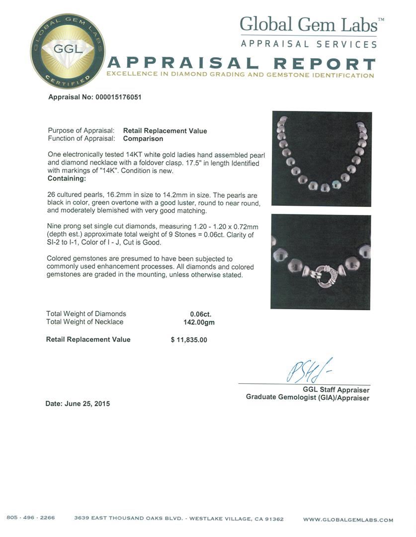 One electronically tested 14KT white gold ladies hand assembled pearl and diamond necklace with a foldover clasp. 17.5" in length Identified with markings of "14K". Condition is new. Containing: Nine prong set single cut diamonds, measuring 1.20 - 1.20 x 0.72mm (depth est.) approximate total weight of 9 Stones = 0.06ct. Clarity: SI-2 to I-1. Color: I - J, Cut is Good. Colored gemstones are presumed to have been subjected to commonly used enhancement processes. All diamonds and colored gemstones are graded in the mounting, unless otherwise stated. 26 Tahitian pearls, 16.2mm in size to 14.2mm in size. The pearls are black in color, green overtone with a good luster, round to near round, and moderately blemished with very good matching. Total Weight of Diamonds 0.06ct. Total Weight of Necklace 142.00 grams. GGL Appraised at $11,835.00.