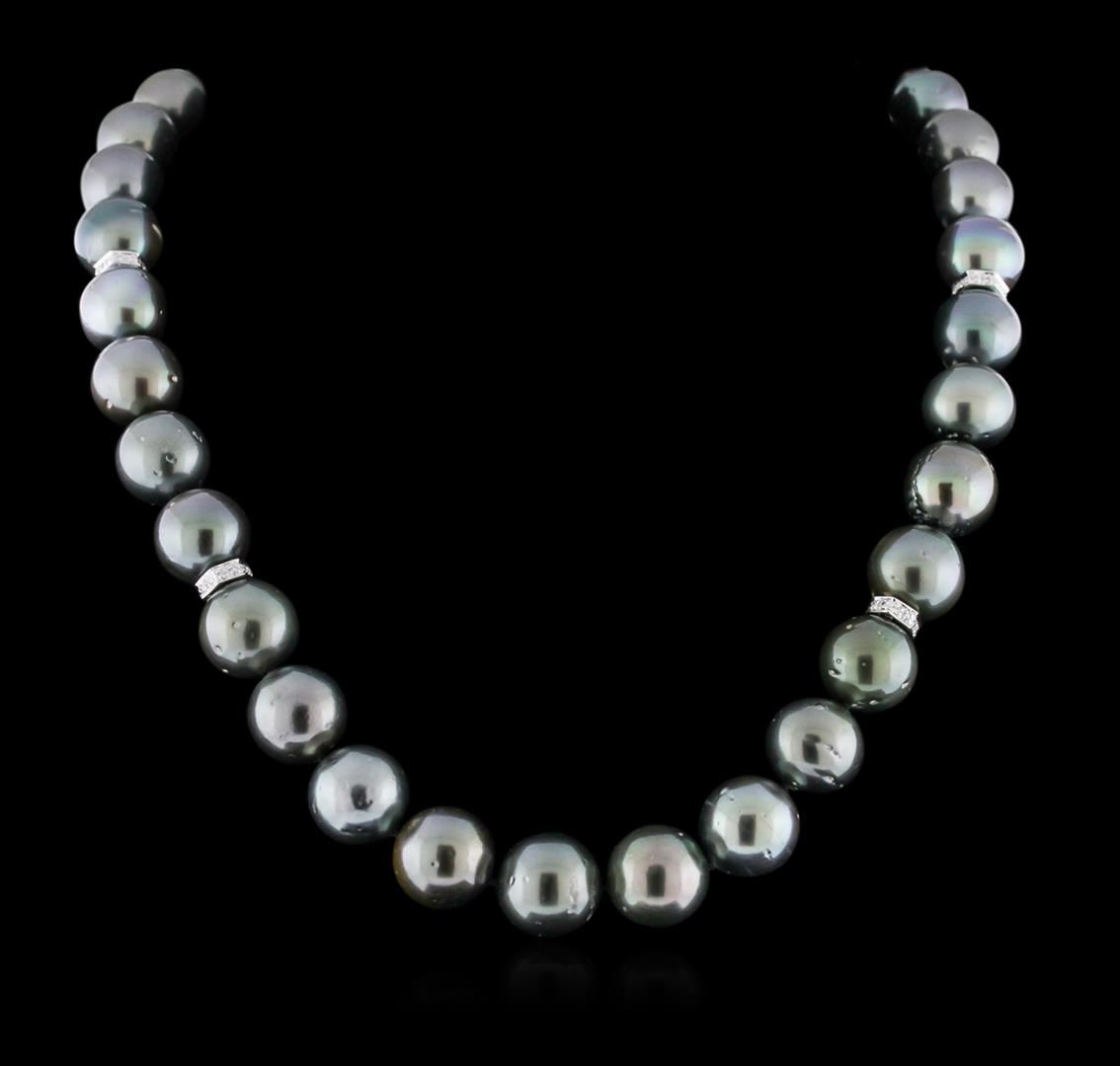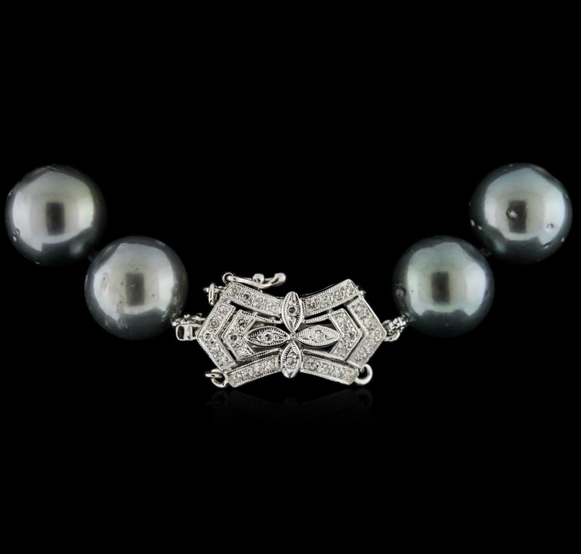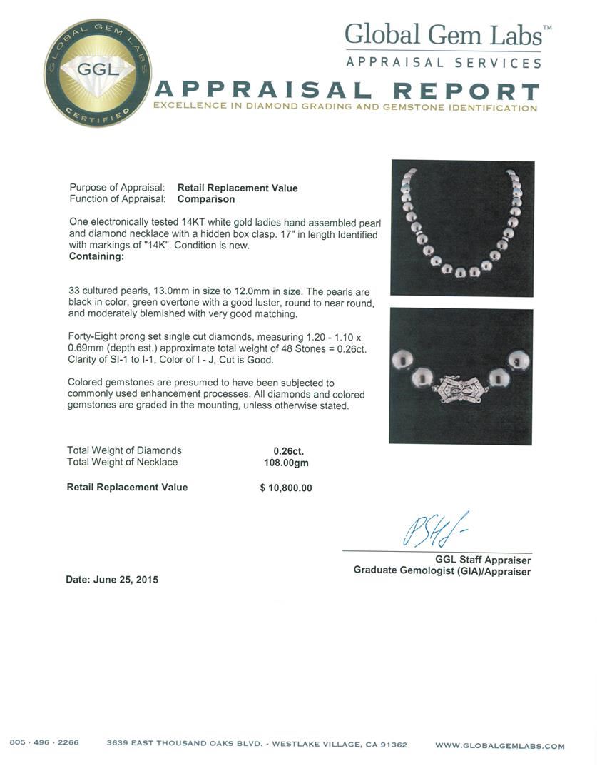 One electronically tested 14KT white gold ladies hand assembled pearl and diamond necklace with a hidden box clasp. 17" in length Identified with markings of "14K". Condition is new. Containing: 33 cultured pearls, 13.0mm in size to 12.0mm in size. The pearls are black in color, green overtone with a good luster, round to near round, and moderately blemished with very good matching. Forty-Eight prong set single cut diamonds, measuring 1.20 - 1.10 x 0.69mm (depth est.) approximate total weight of 48 Stones = 0.26ct. Clarity: SI-1 to I-1. Color: I - J, Cut is Good. Colored gemstones are presumed to have been subjected to commonly used enhancement processes. All diamonds and colored gemstones are graded in the mounting, unless otherwise stated. Total Weight of Diamonds 0.26ct. Total Weight of Necklace 108.00 grams. GGL Appraised at $10,800.00.