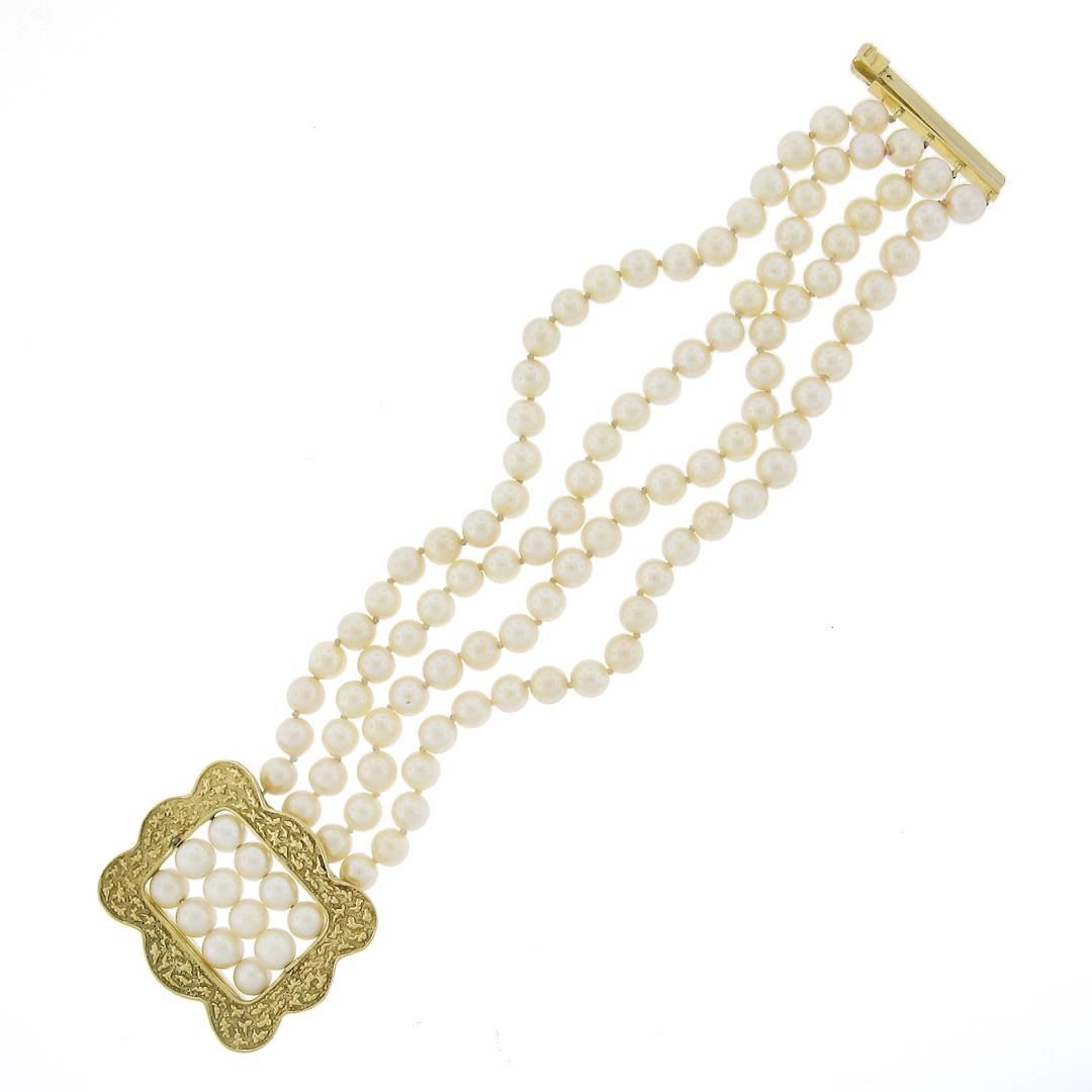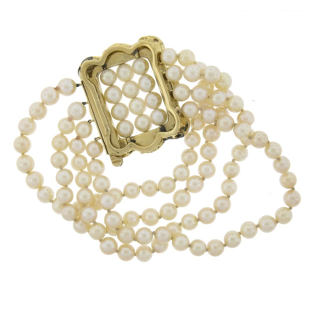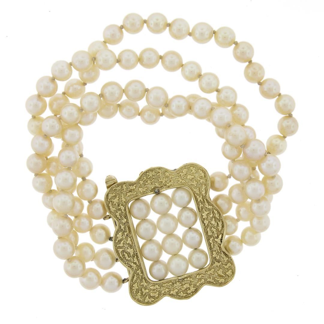 A 4 row strand bracelet with 14k yellow gold clasp, featuring 108 round shape cultured pearls (5-6mm each). It weighs a total of 44.02 grams, measures 37.2mm wide, and measures 6.25 inches in length.