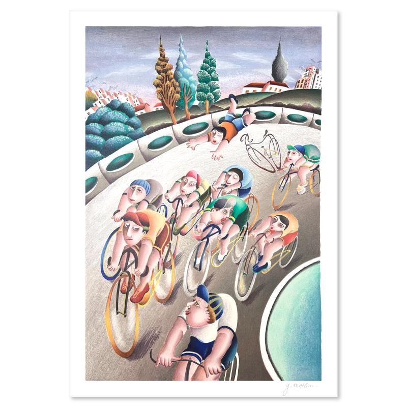 Cycling by Mahler, Yuval. "Cycling" is a limited edition serigraph on paper by Yuval Mahler. The piece comes hand signed by the artist, numbered, and with a letter of authenticity. Measures approximately 19.5" x 13".